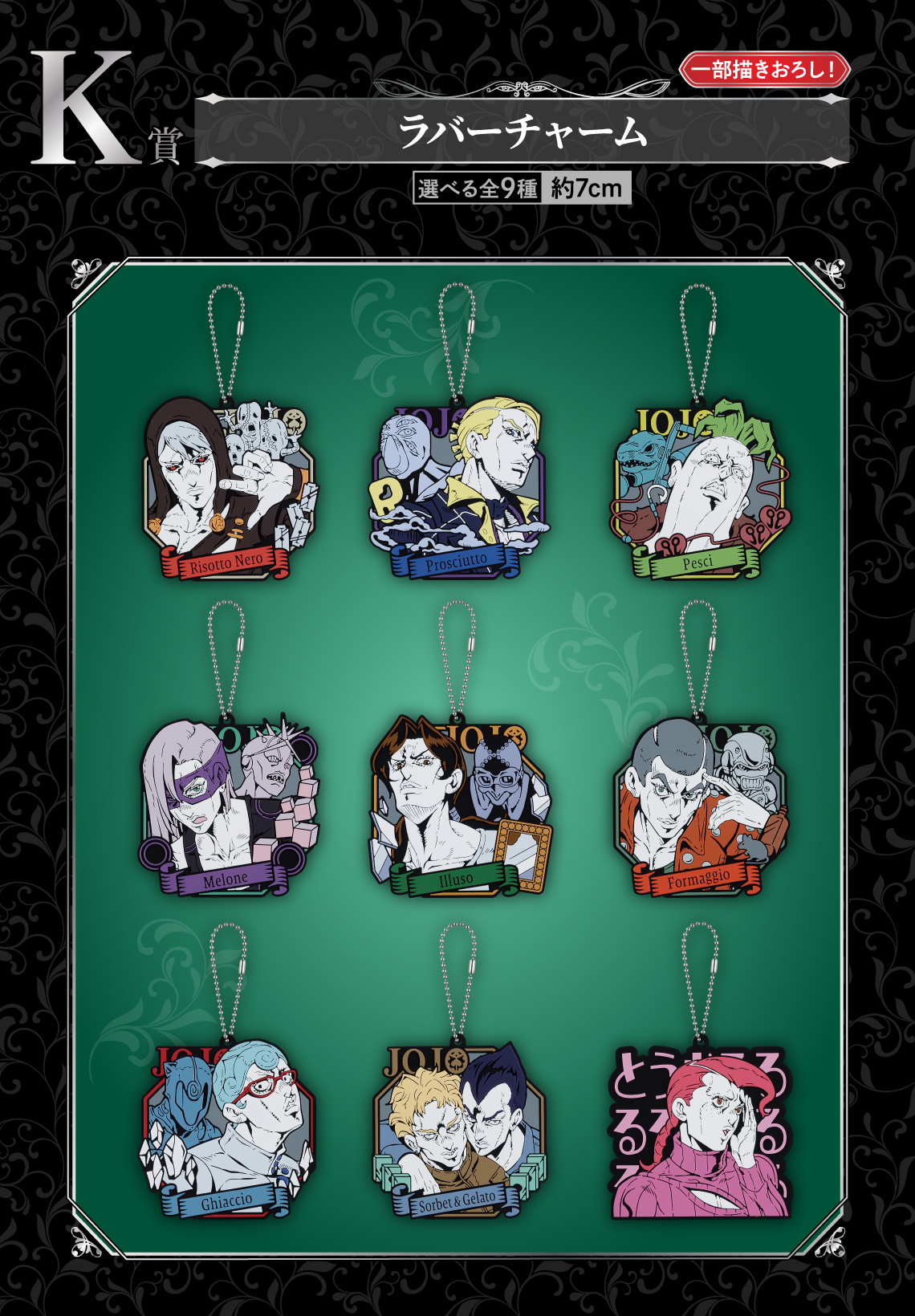 繼布加拉提小隊之後,「一番賞 JOJO的奇妙冒險 GOLDEN WIND -HITMAN TEAM-」暗殺小隊也登場!收錄有 A 賞~ L賞+最後賞、雙重中獎機會等豐富的獎項,收錄有高階造型的「MASTERLISE」系列模型:A賞 暗殺小隊隊長「里蘇特·涅羅」、B賞「普羅修特」、C賞「貝西」、D賞「梅洛尼」、E賞「伊魯索」、F賞「霍爾馬吉歐」、D賞「加丘」,以及最後賞的「托比歐」角色模型!豐富的陣容一字排開超級帥氣!