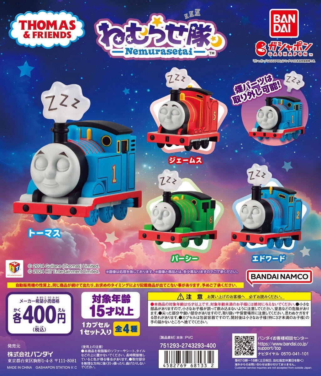 日本萬代公司轉蛋事業部 GASHAPON 旗下熱門的「沉睡隊」(ねむらせ隊)系列將推出《湯瑪士小火車》主題的新商品——「湯瑪士小火車 沉睡隊」轉蛋,參考售價為每轉 400 日圓,預計於 2024 年 12 月第四週開轉!