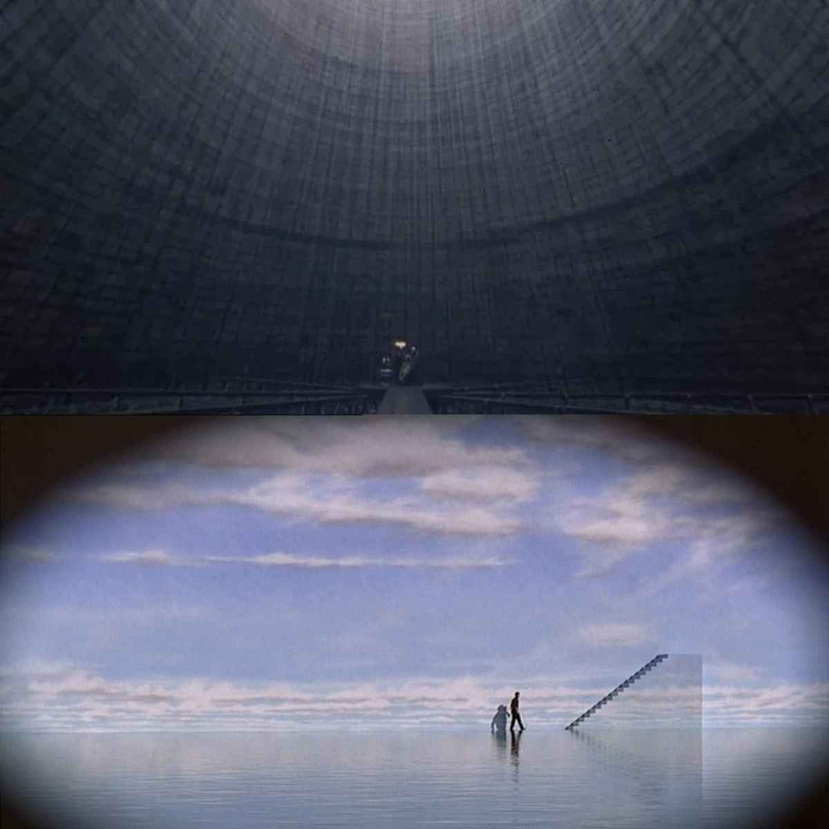 而我為甚麼會選《巴西》當《楚門的世界》的聯映電影呢?因為當我看著那張楚門撫摸高牆的照片,就讓我聯想到《巴西》的結局畫面,遠景鏡頭,遠處中央主角山姆坐在手術椅上,一動也不動就像是空殼一樣,四周圍繞著冰冷的金屬高牆,《巴西》的旋律也隨之浮現,就像是導演泰瑞吉連在海灘遇到那位男人一樣,自身心靈已達到天堂般的自由,但是肉體卻困在充滿灰土的地獄中,最終還是敗給強大的體制中;而楚門的心靈被巨大的牢籠束縛,但到最後靠著自己的意志打破高牆,邁向真實與自由。