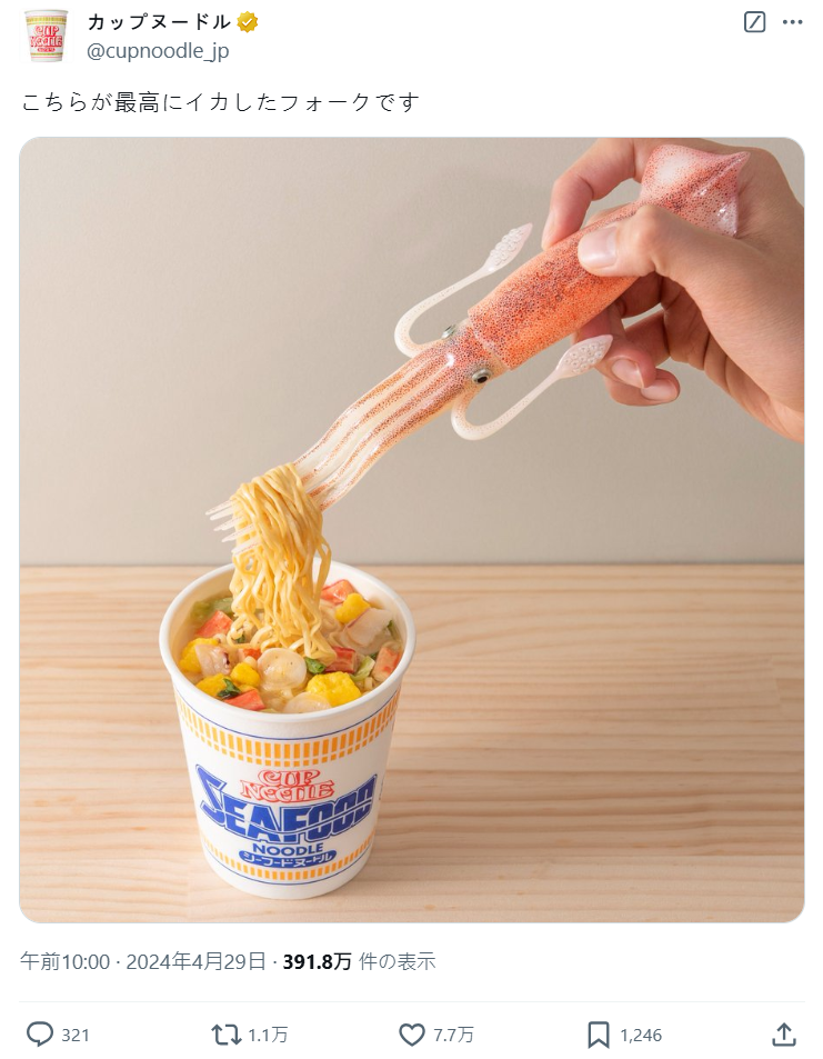 這事實上是日清在今年 4 月貼出的照片,「杯麵魷魚叉」顧名思義就是將叉子變成魷魚的造型,將觸手變成叉子的創意。雖然這本體與日清似乎沒有太大關聯,但這種莫名的創意的確符合日清玩味,不少網友也敲碗表示很想要。