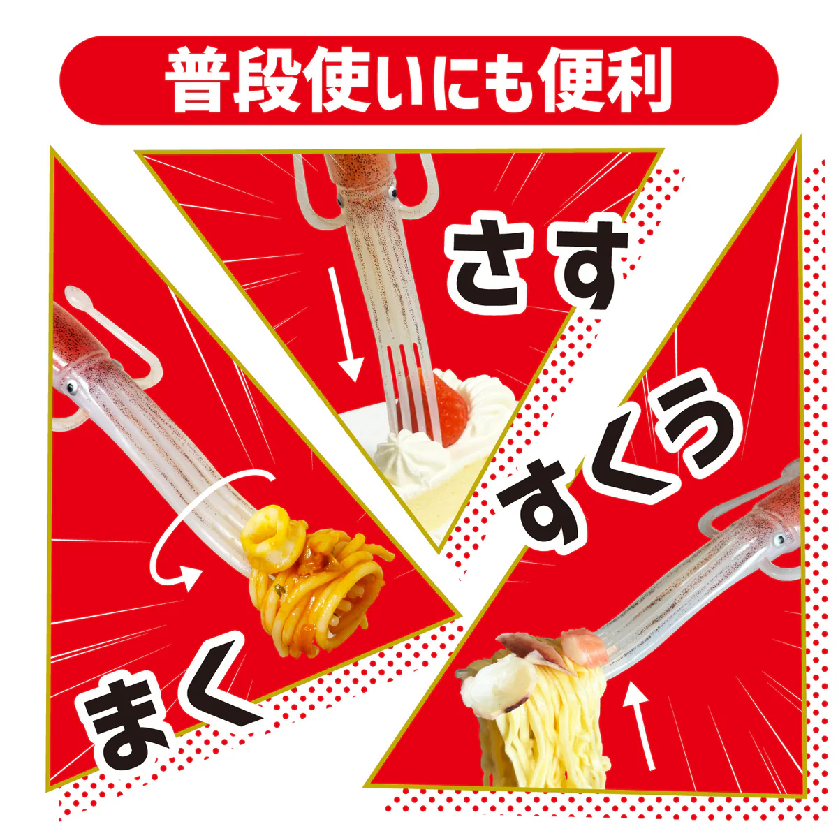 用起來就跟一般叉子沒兩樣,完美重現魷魚的外型與色澤,設計握感舒適,不僅實用性滿分,除了吃「杯麵」外,用來享用義大利麵或肉類料理也非常方便!