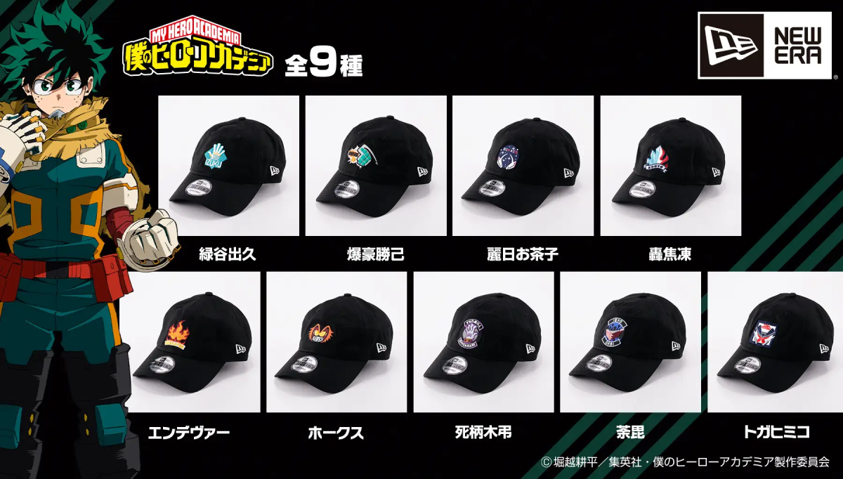 帽體採用 9THIRTY™ 設計,共有 9 種款式,靈感來自《我的英雄學院》中深受喜愛的角色,包括:綠谷出久、爆豪勝己、麗日御茶子、轟焦凍、奮進人安德瓦、霍克斯、死柄木弔、荼毘,以及渡我被身子。