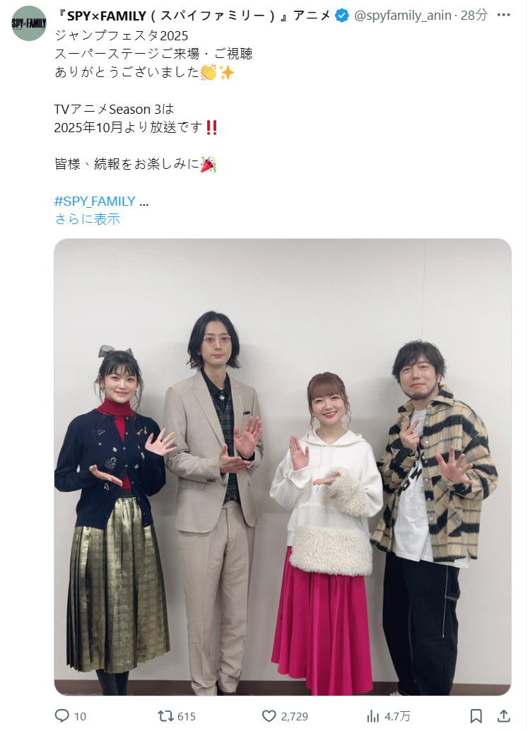 今年 6 月也正式宣布動畫第三季確定製作,而今日 ( 12/21 ) 的「Jump Festa 2025」 活動舞台上,官方也正式公布《SPY×FAMILY 間諜家家酒》第三季將於 2025 年 10 月開播,相隔兩年播出。