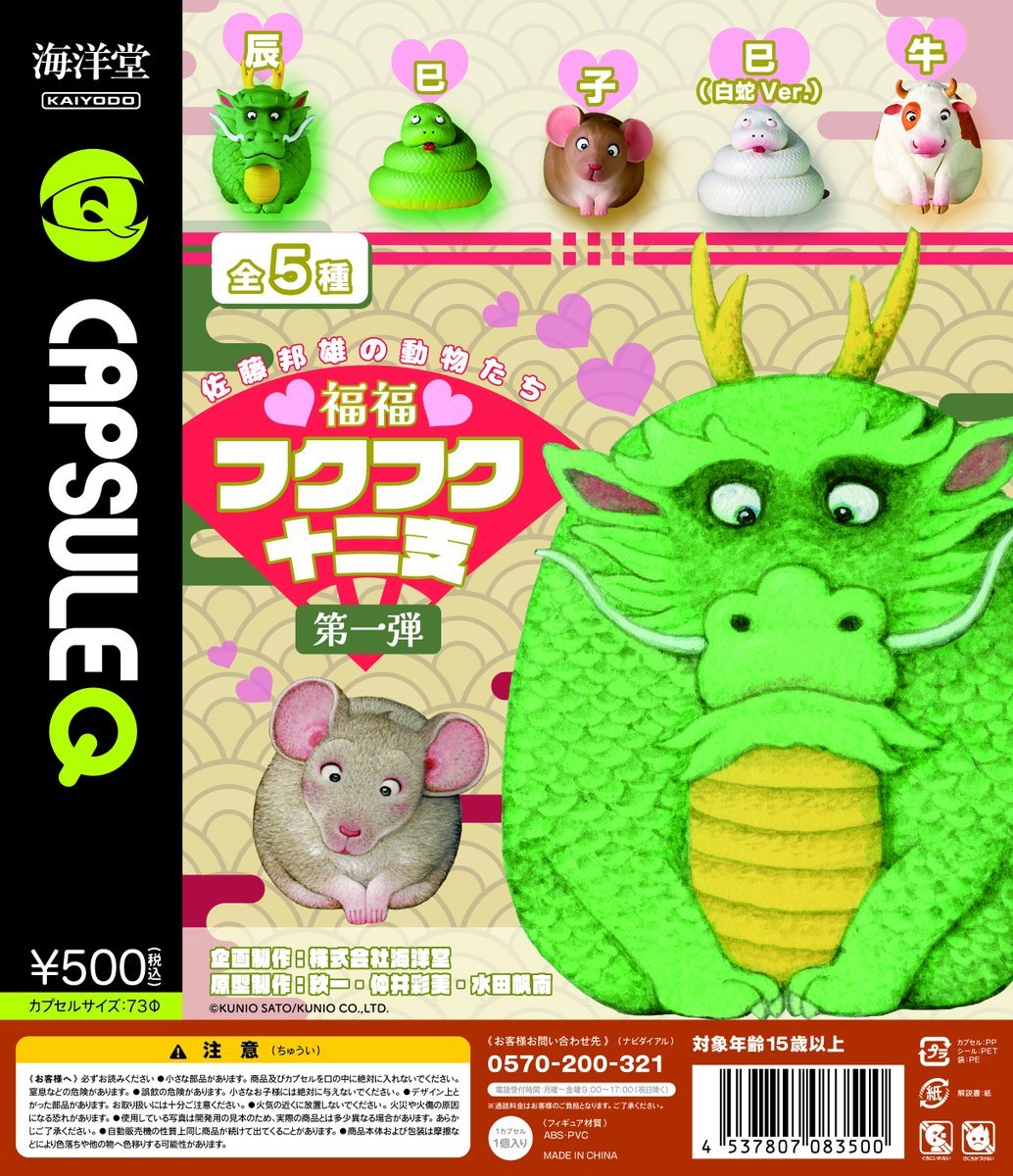 日本玩具公司 海洋堂,旗下專門製作精緻縮小轉蛋尺寸的《膠囊Q博物館》(カプセルQミュージアム)系列,再度與藝術巨匠 佐藤邦雄老師攜手,推出十二生肖系列首彈:「膠囊Q博物館 佐藤邦雄的動物們 福福十二支 第一彈」轉蛋,一共五種款式,一轉售價 500 日圓,於 2024 年 12 月開轉。