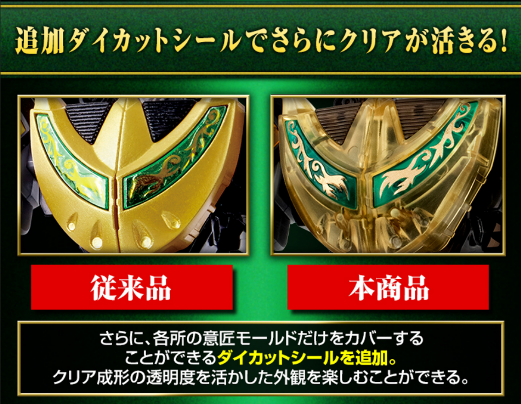 「SMP 龍皇凱薩 透明配色Ver.」基於過去發售的 SUPER MINIPLA 版本修改而來,全身零件提升銀色成型色的金屬質感,而黑、綠、金等零件則改為透明成型色製作,呈現帶有獨特光澤感、透光感的造型。此外全身多處補色貼紙也重新調整色彩,特別透明綠零件內側新增能夠提升反光率的鏡面銀色貼紙,搭配外側圖樣表現出水晶般的光澤。