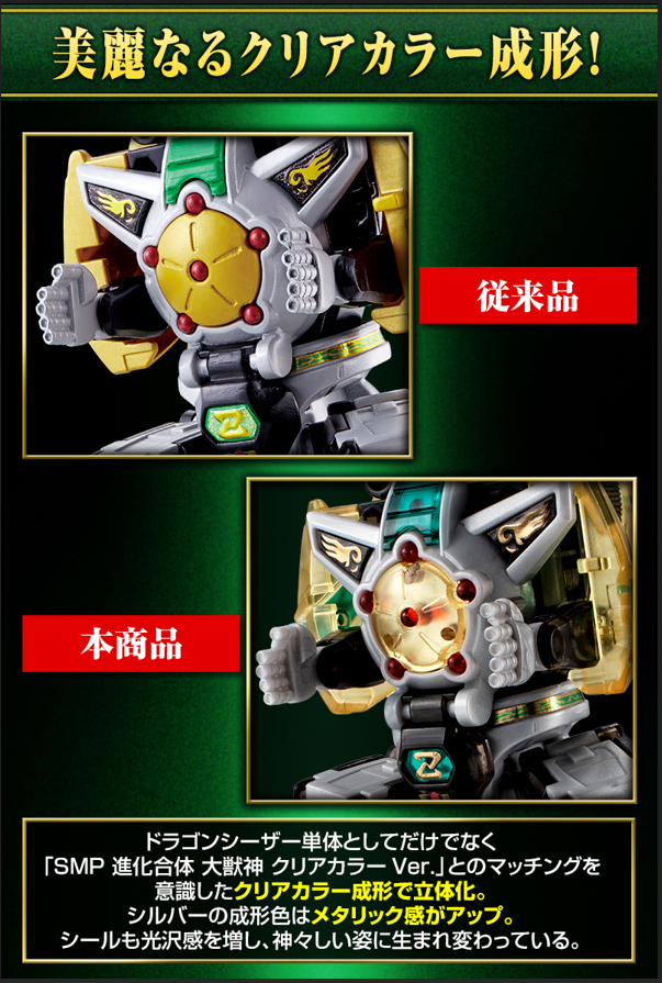 此外的變形合體機構則與一般版相同,能夠搭配質感相同的另售商品「大獸神 透明配色Ver.」合體為「鋼龍神」、「獸帝大獸神」等形態,整體色彩相較一般成型色版更加華麗!