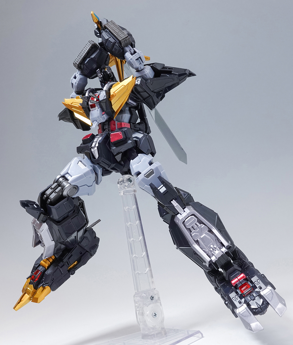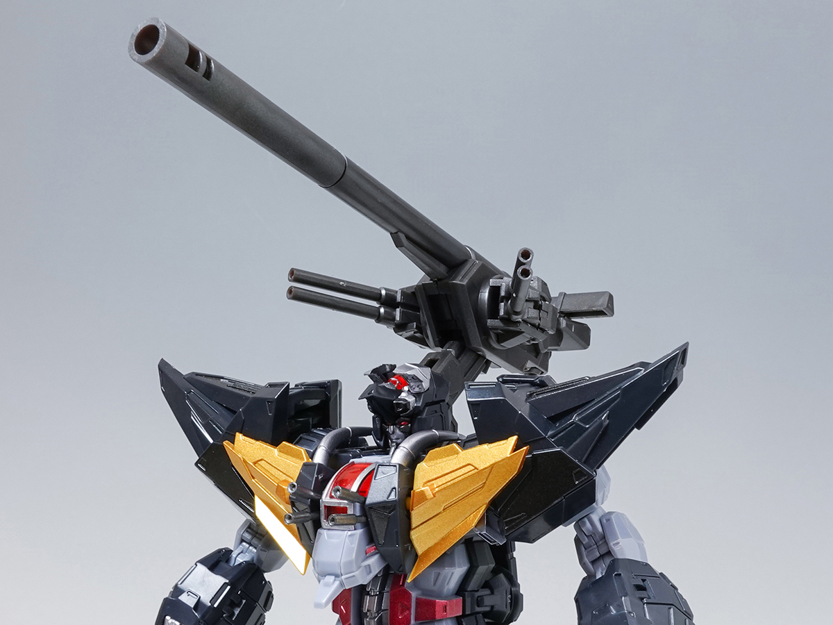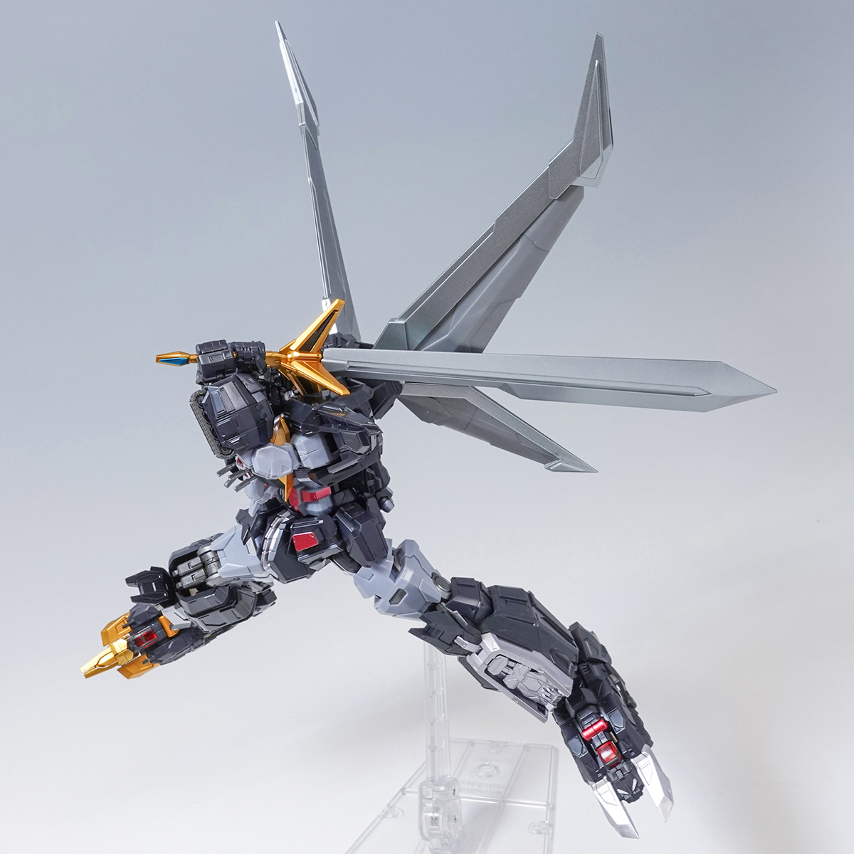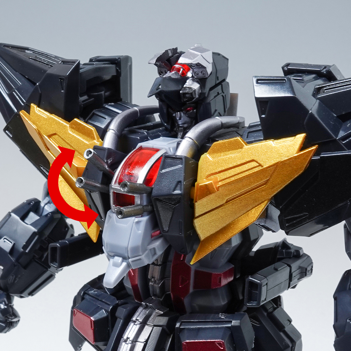 此外配件還附上了 X 型的強化飛翼、可換件露出噴嘴的噴射組件,能夠裝備在背部與後裙甲使機體輪廓、細節更加帥氣。各部靈活而牢固的可動關節設計能夠把玩出帥氣的拳擊、踢擊等格鬥姿勢,背部搭載的各砲管也能轉向前方再現施展「斷空砲」的姿態。而招牌武器「斷空劍」當然也一併附上,能搭配拉出式肩關節雙手持劍,再現施展必殺技「斷空光牙劍」的姿態!