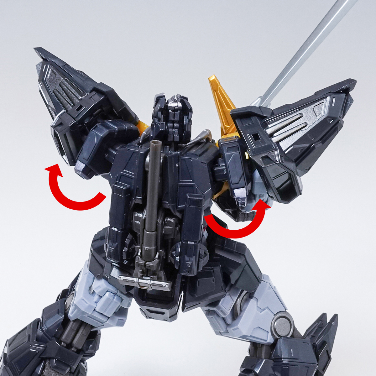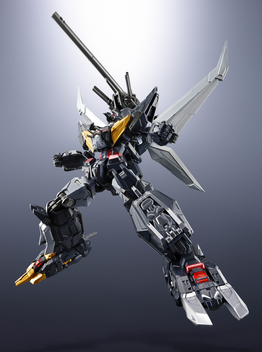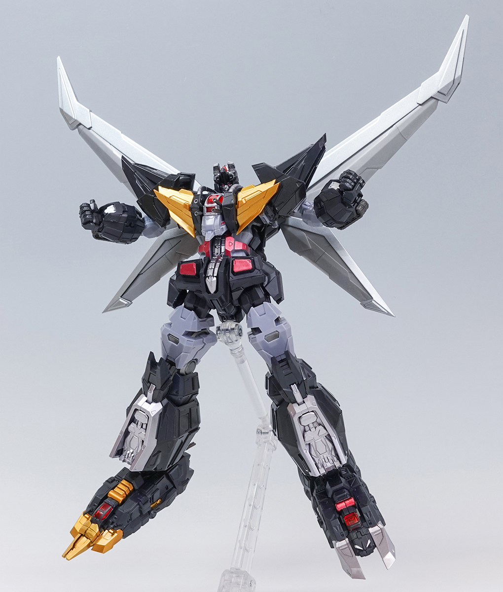 此外配件還附上了 X 型的強化飛翼、可換件露出噴嘴的噴射組件,能夠裝備在背部與後裙甲使機體輪廓、細節更加帥氣。各部靈活而牢固的可動關節設計能夠把玩出帥氣的拳擊、踢擊等格鬥姿勢,背部搭載的各砲管也能轉向前方再現施展「斷空砲」的姿態。而招牌武器「斷空劍」當然也一併附上,能搭配拉出式肩關節雙手持劍,再現施展必殺技「斷空光牙劍」的姿態!