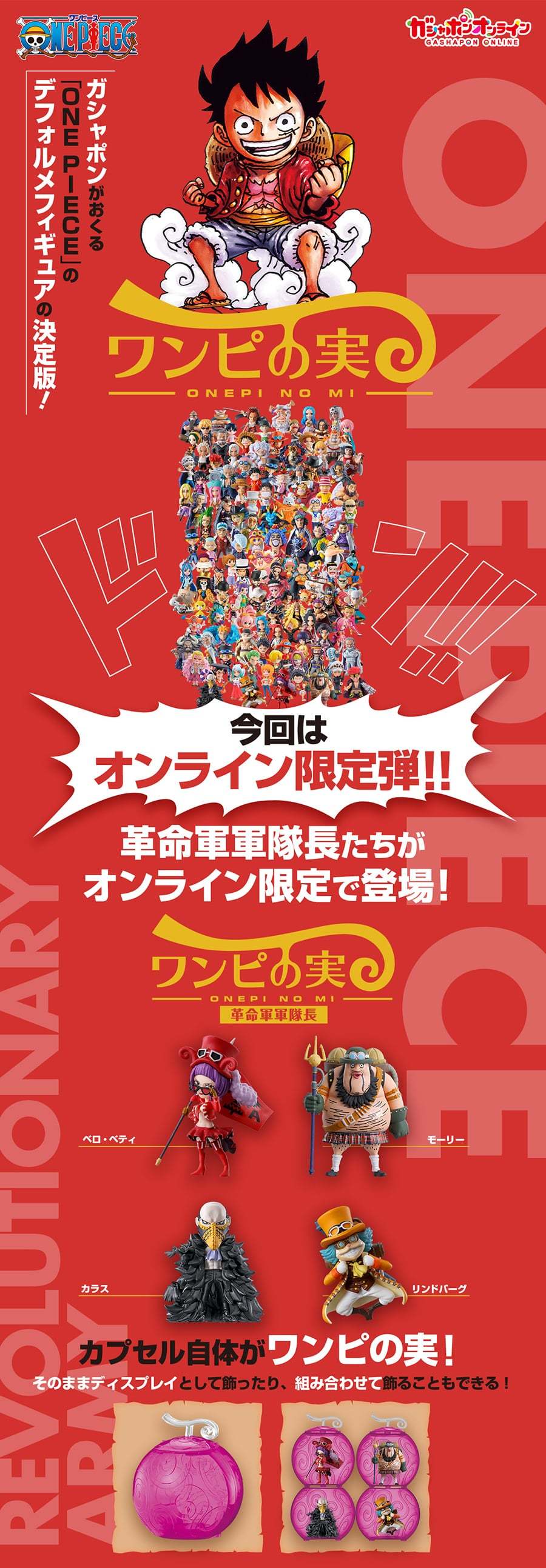 由日本萬代轉蛋事業部 GASHAPON 發行、讓尾田榮一郎老師都激推的《航海王》主題轉蛋「ワンピの実 (航海王的果實) 」發表了最新彈「革命軍軍隊長」!現正於 GASHAPON ONLINE 展開預訂,將在 2025 年 6 月開始發貨,一共有四種款式可以收集,建議售價為每轉 500 日幣。