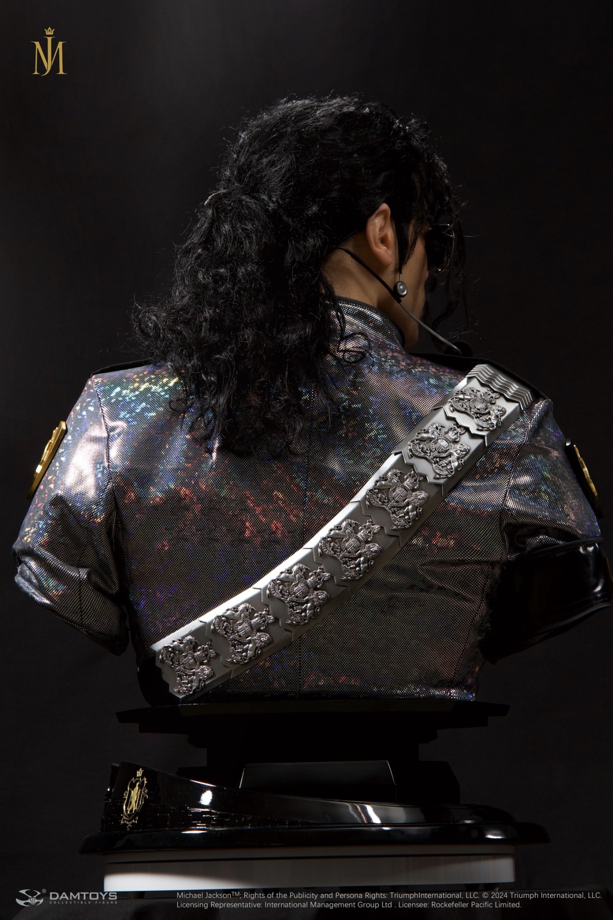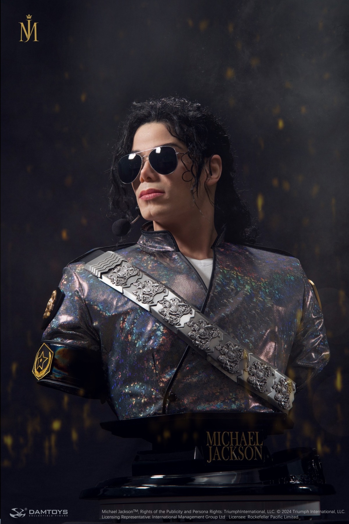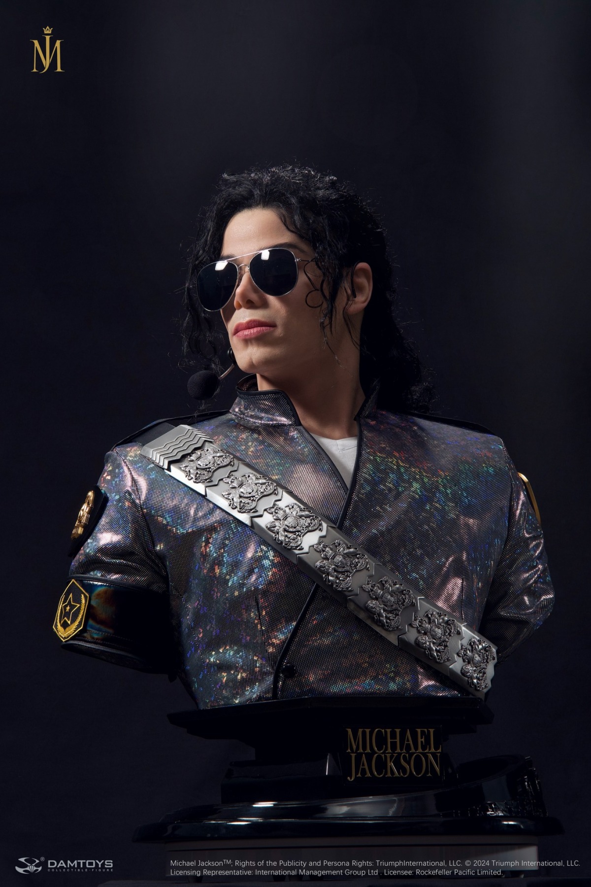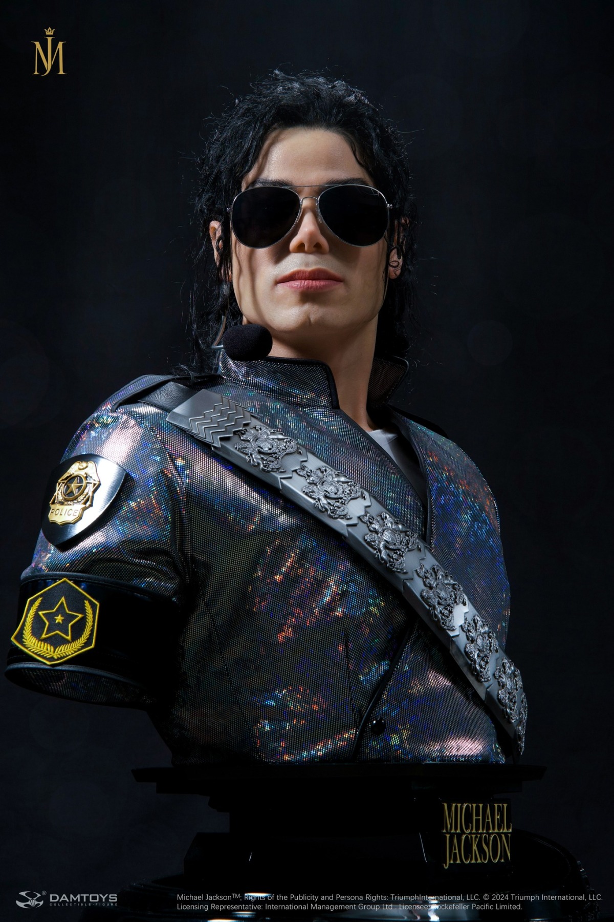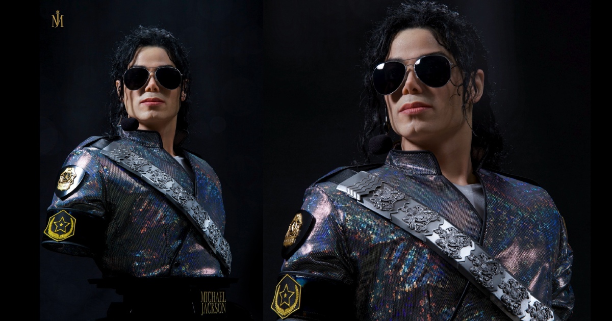 1/1 比例超寫實胸像高約 78 公分,製作出麥可登台後面無表情站立在舞台上的模樣,以鉑金矽膠雕刻翻模精緻的還原了麥可的五官,服裝部分以特殊布料剪裁重現了當晚閃亮的表演服,臂章、揹帶等細節都被一併重現!頭髮部分以植髮技術一根根的製作,讓整體看起來更加的寫實,墨鏡、耳麥等配件細節也是毫不馬虎!底座部分在前方刻有金色的「MICHAEL JACKSON」字樣,無比寫實的造型配上等身的比例,讓人彷彿可以聽見布加勒斯特體育館內震耳欲聾的尖叫聲!