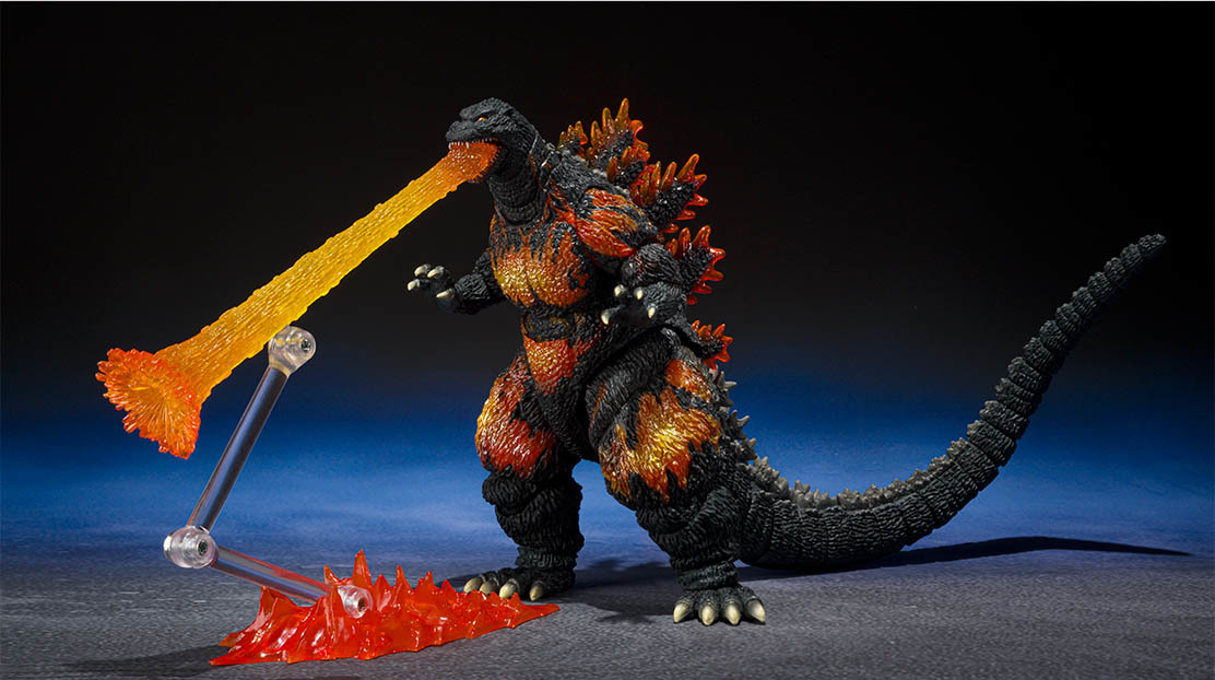 「S.H.MonsterArts 紅蓮哥吉拉 (1995) 70周年特別紀念Ver.」基於 2012 年推出的初始版本修改而來,由日本哥吉拉造型家第一人酒井裕司擔任原型製作與色彩,大幅再現劇中戲服造型,在全高 16 公分尺寸下表現出怪獸王極具魄力的身影。整體配色基於劇中夜間戰鬥的形象重現調整,運用新色彩與塗裝技法表現雙眼、體表發光的模樣。