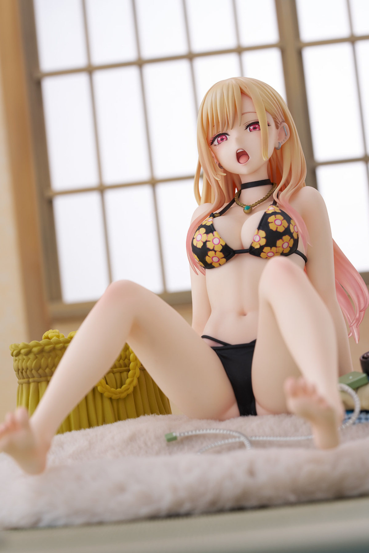 本次的「喜多川海夢 ~泳衣 Ver.~」1/6 比例塗裝完成品高約 16.5 公分,製作出當新菜因為害羞而遲遲不敢著手丈量,海夢坐在棉被堆上將腳跨在他腿上催促著說「別管了,快做!」時的動作,雕刻呈現出海夢豐滿而纖細的姣好身材,被泳衣托起的胸部、腰部的肌肉紋理及修長的腿部曲線都得到了細膩的刻畫,並採用 Spiritale 獨特的「光滑表皮加工」技術打造出皮膚吹彈可破的視覺效果,在黑底太陽花紋的泳衣襯托下顯得更加白皙!