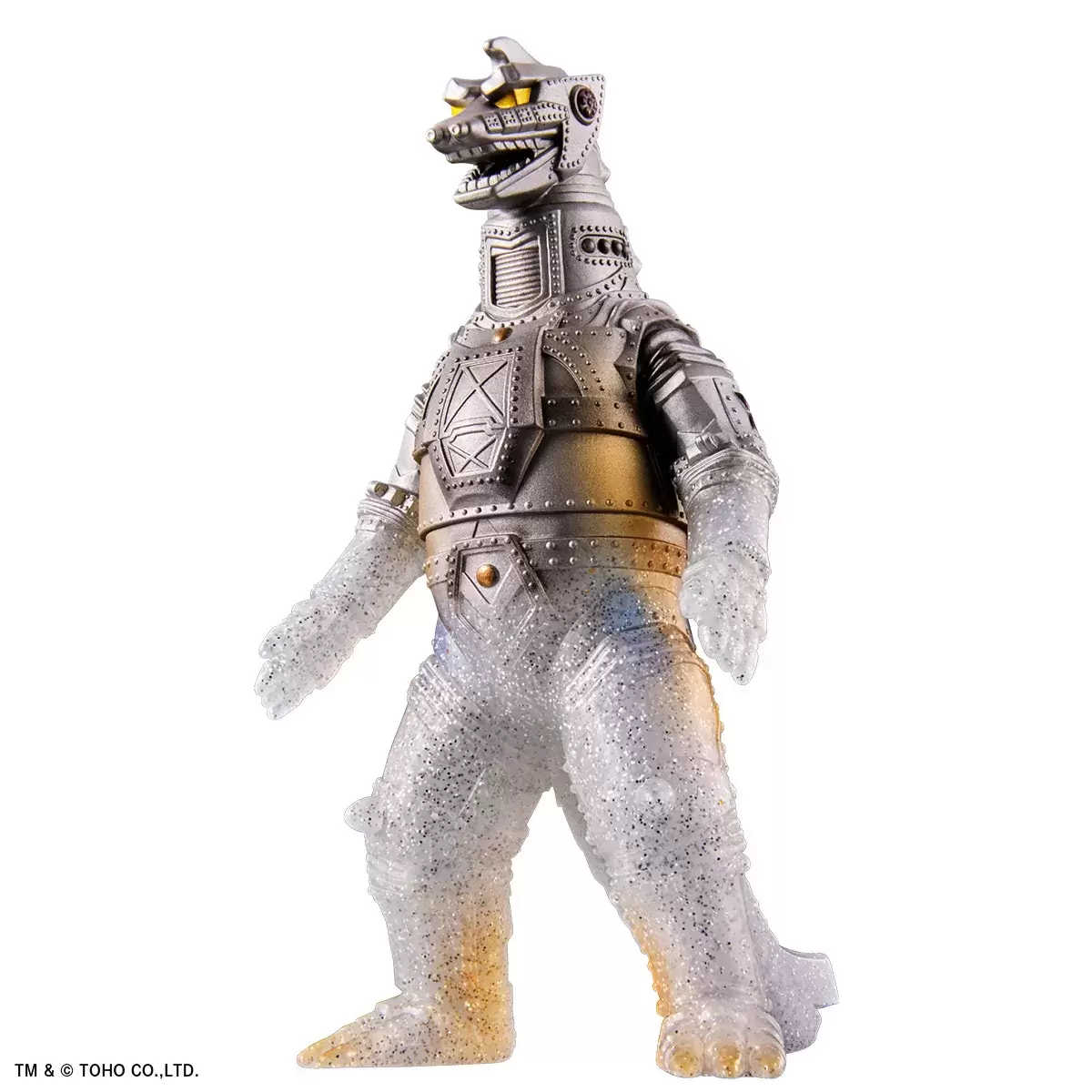 另外還有「機械哥吉拉(1974)登場畫面Ver.」,呈現機械哥吉拉脫去偽裝的初登場畫面!還原表面的哥吉拉皮被火燒掉,一身銀白色金屬機體盡現,並散發光芒的變身瞬間。在雙臂以下的下身採用內含亮片金粉的半透明材質製作,上半身漸層為厚重感十足的金屬塗裝,形成強烈對比。除此之外,更施以淡淡的火光塗裝,營造出在火焰反射下暴露真實身份的場景。
