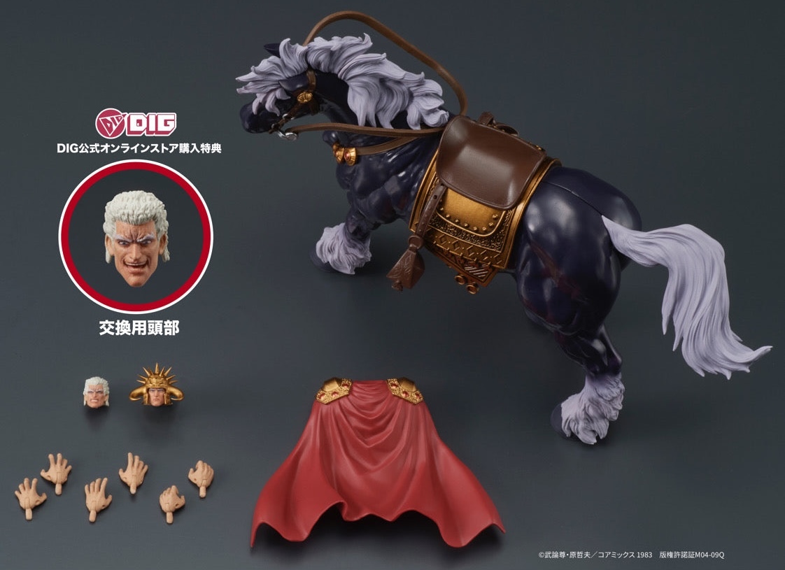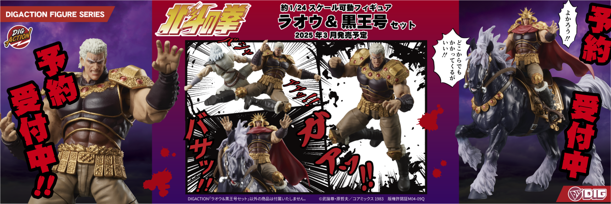 日本 M.I.C. 公司(株式会社エムアイシー)的原創玩具品牌 「DIG」(ディーアイジー)旗下全新的可動人偶系列「DIGACTION」再度推出了經典漫畫《北斗神拳》主題的新商品——「拉歐 & 黑王號」1/24 比例可動人偶套組,參考售價為 9,900 日圓,預計於 2025 年 03 月發售!