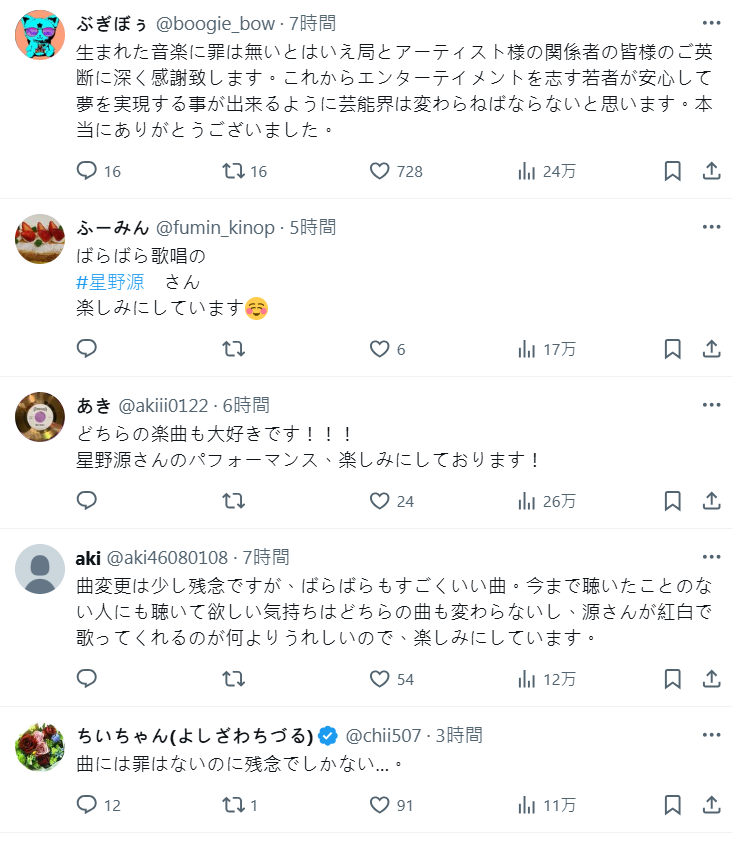 雖說變更歌曲已經成為事實,不少網友仍抱怨歌本身並沒有罪過,是關聯作品的人士犯下的惡行,甚至也與星野源無關,要被牽連被迫換歌有點讓人覺得太超過。當然也有支持換歌曲的網友表示,這種選曲會引來二度傷害,希望不要讓那些受傷的藝能人士想起那些傷痛。