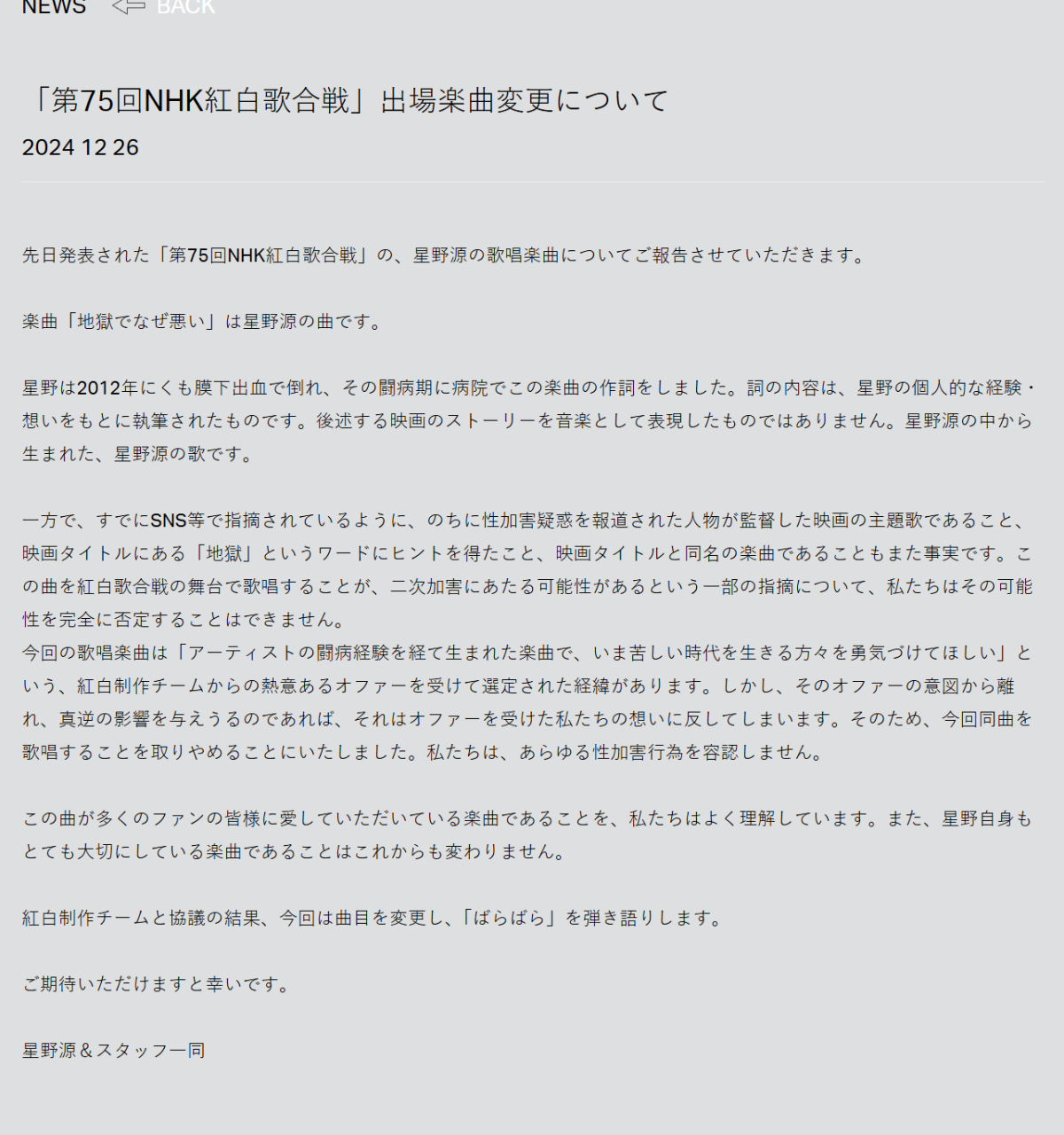 此外,我們要強調,不論是星野源本人,還是 NHK,都始終堅持「絕不容忍性暴力」的立場,這是不言自明的原則。紅白製作群與星野源的團隊再次進行了協商,考量到整體節目結構與演出安排,我們最終決定將星野源的演唱曲目更改為其首張專輯《笨蛋之歌》中的收錄曲「各分東西,ばらばら」。敬請期待紅白製作團隊與星野源共同努力呈現的精心表演!