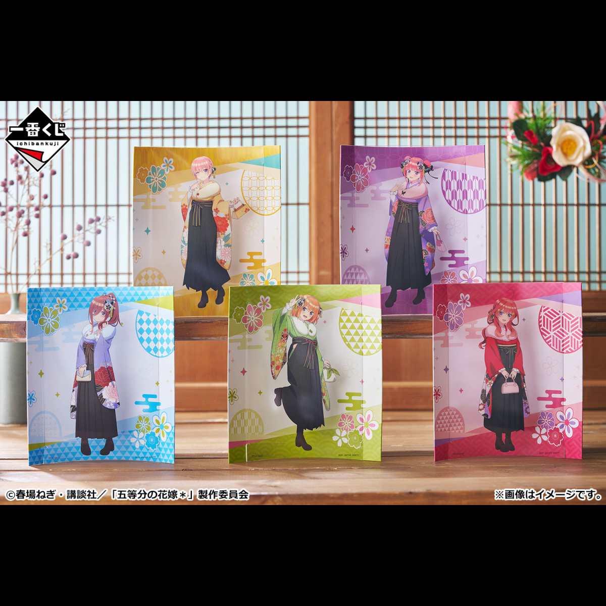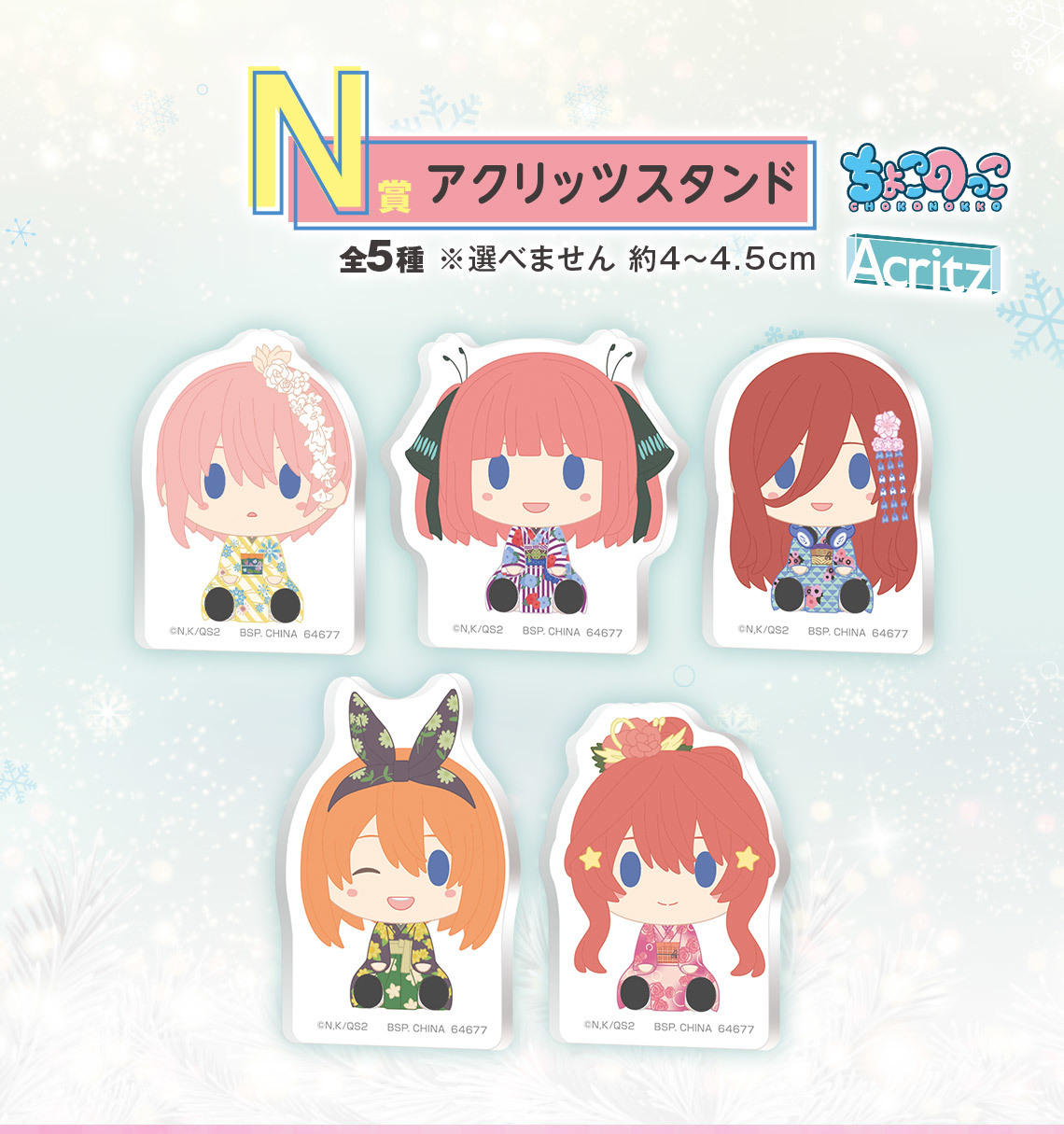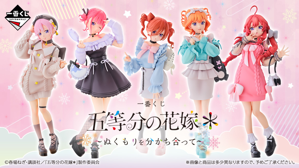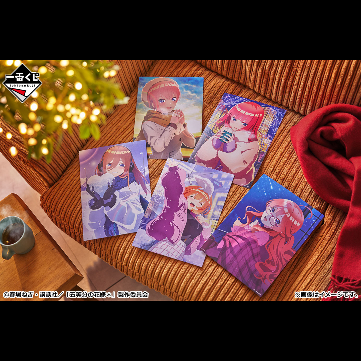「一番賞 五等分的新娘*∽分享溫暖~」,共有 A賞 ~ O 賞 + 最後賞的豐富賞品,收錄有 A賞 中野一花(外出Style)、B賞 中野二乃(外出Style)、C賞 中野三玖(外出Style)、D賞 中野四葉(外出Style)、E賞 中野五月(外出Style)五款將一番賞原畫立體化的的角色人偶!另外 F~G 賞 則是新繪製的五姊妹新春造型大型壓克力立牌(正月Style),以及新繪製的冬季插畫板、L賞如果有愛就能分辨五胞胎貼紙套組、用於背景展示的 M 賞藝術背卡系列、N賞Chokokko壓克力立牌、O賞 徽章套組和最後賞的冬季主題場景的新插圖板,讓五胞胎陪你暖暖過冬!