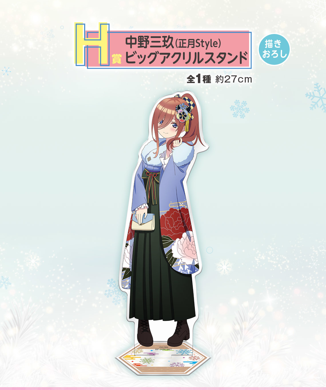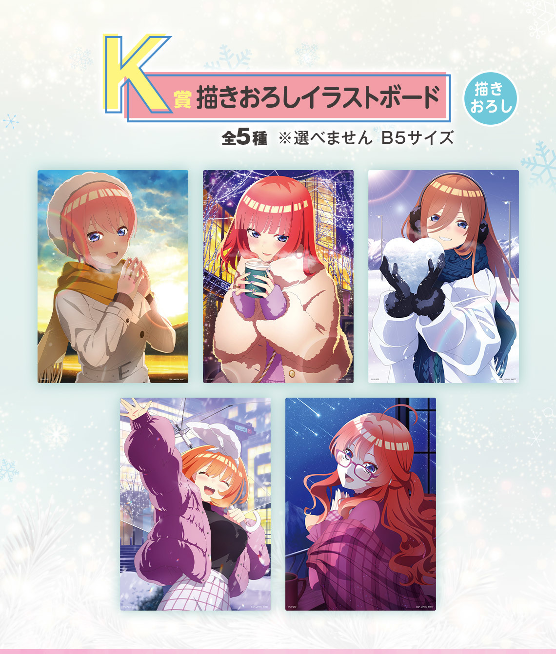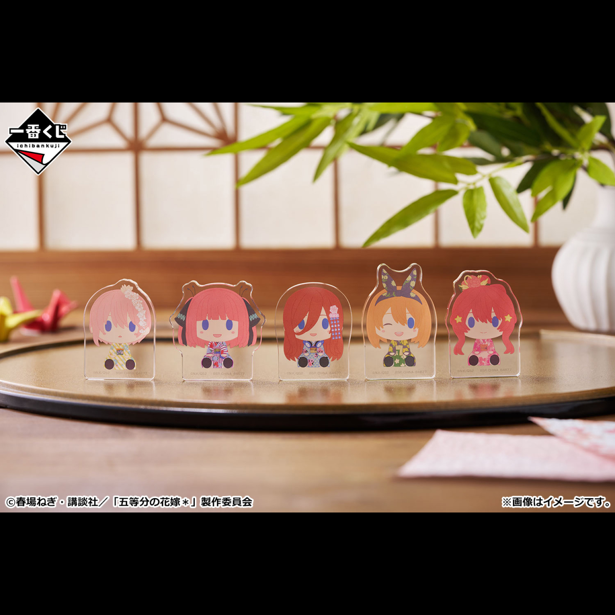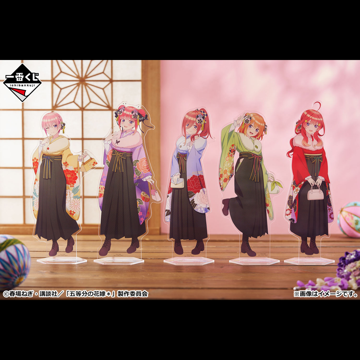 「一番賞 五等分的新娘*∽分享溫暖~」,共有 A賞 ~ O 賞 + 最後賞的豐富賞品,收錄有 A賞 中野一花(外出Style)、B賞 中野二乃(外出Style)、C賞 中野三玖(外出Style)、D賞 中野四葉(外出Style)、E賞 中野五月(外出Style)五款將一番賞原畫立體化的的角色人偶!另外 F~G 賞 則是新繪製的五姊妹新春造型大型壓克力立牌(正月Style),以及新繪製的冬季插畫板、L賞如果有愛就能分辨五胞胎貼紙套組、用於背景展示的 M 賞藝術背卡系列、N賞Chokokko壓克力立牌、O賞 徽章套組和最後賞的冬季主題場景的新插圖板,讓五胞胎陪你暖暖過冬!