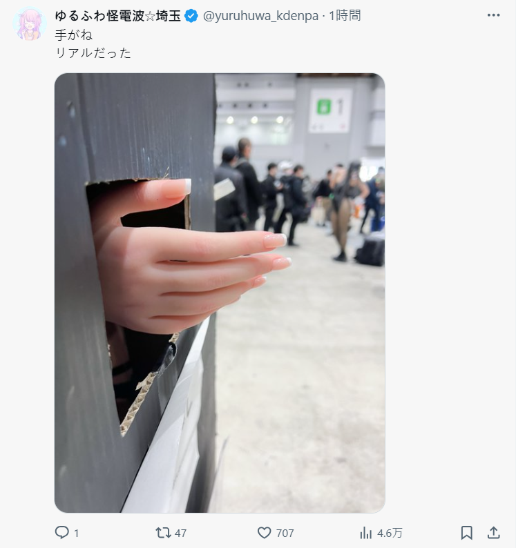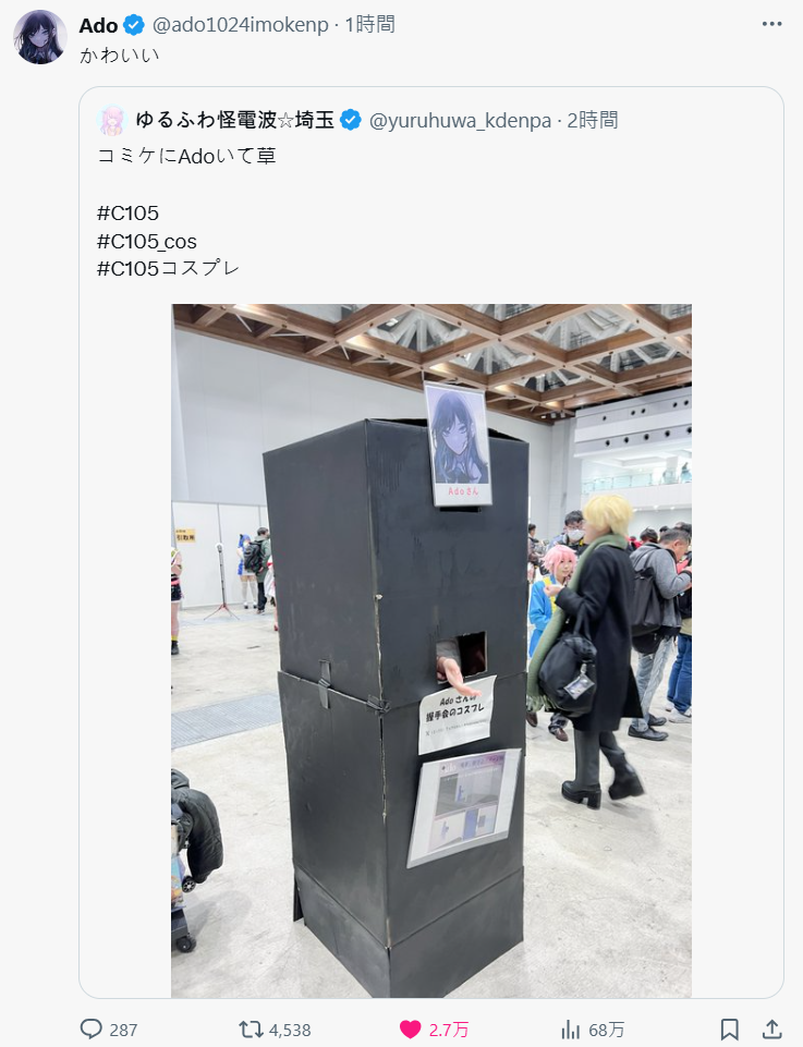 雖說應該 Ado 握手會時是沒有將手伸出箱外的,不過這樣的 Cosplay 的確充滿玩味,先不論裡面是誰,但這個創意的確獲得讚賞,很多人跑去握手 www。