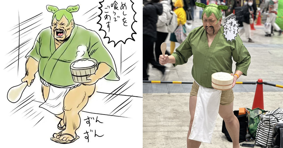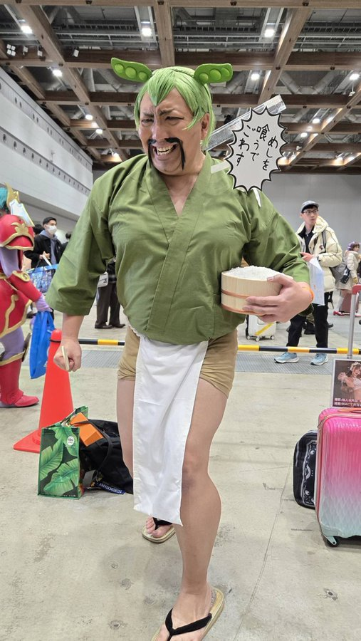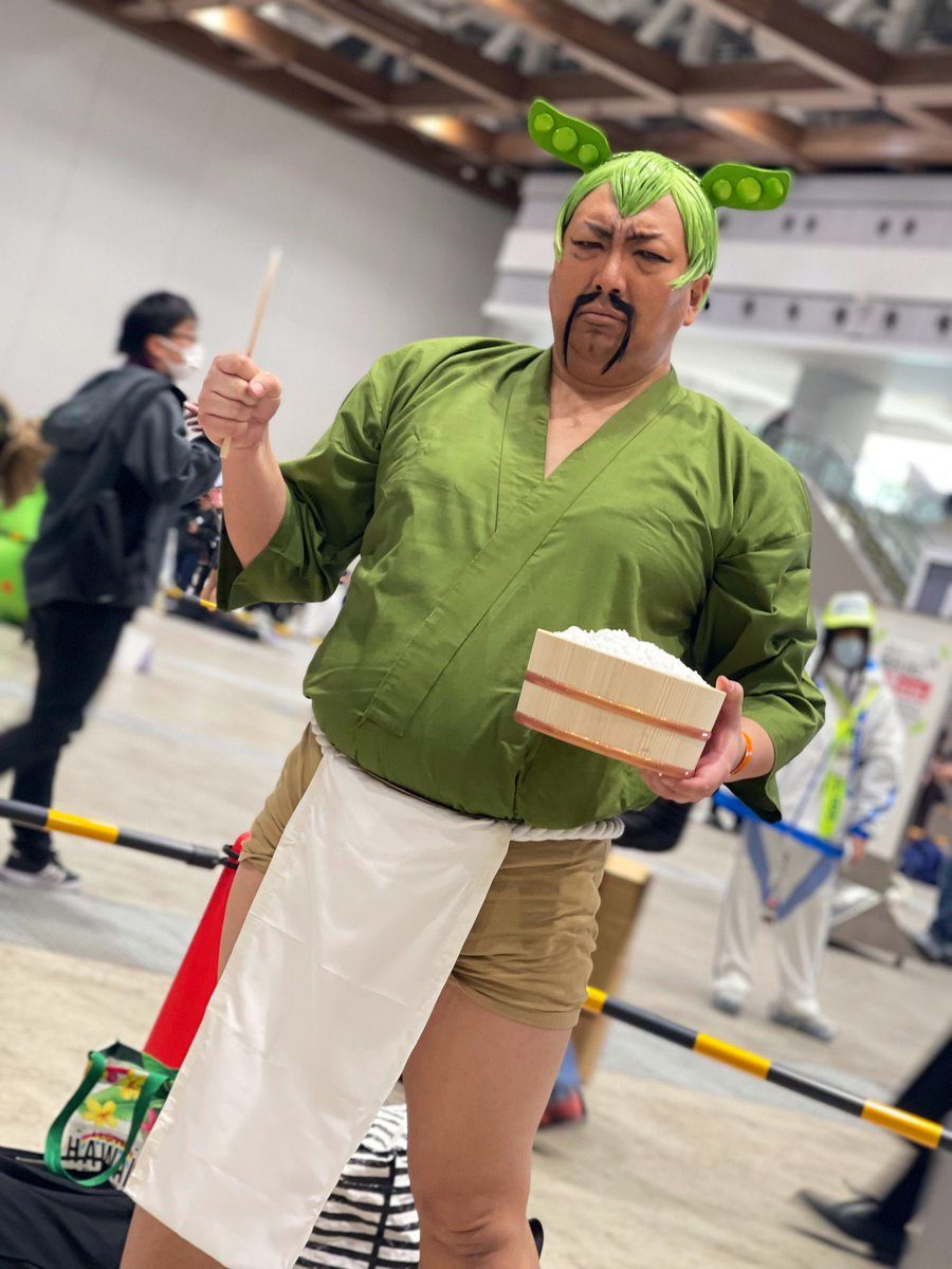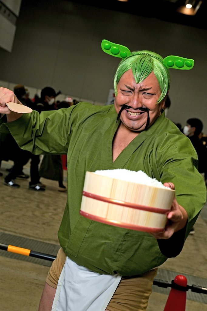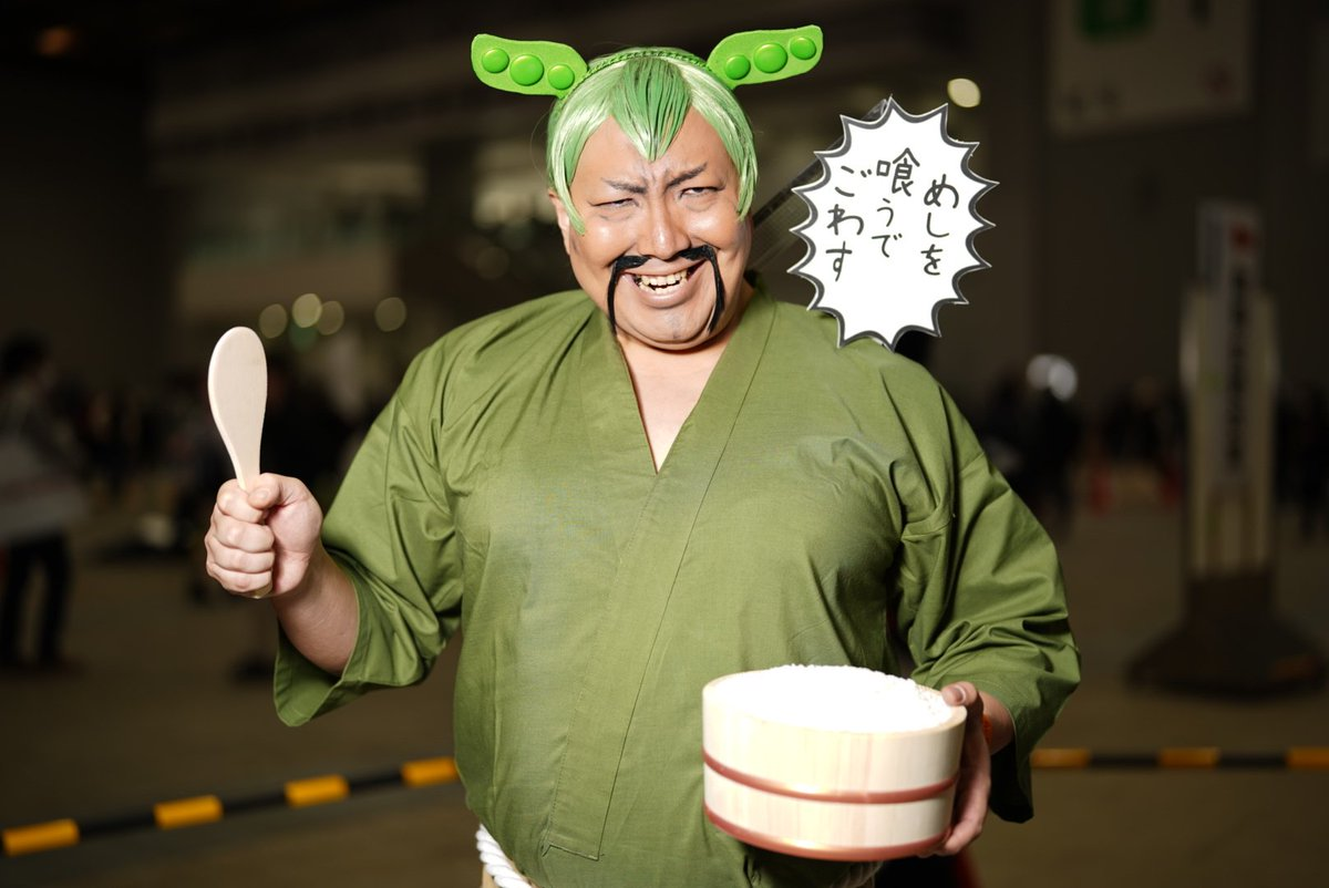而 Coser 殺す気就將原設定的「ずんだどん ( 巨漢 )」還原,不僅頭頂豌豆穿上綠色作業服,肩膀還頂著「めしを食うでごわす!!」標語。也將鬍子、表情神韻都完美呈現,手持一大碗飯跟勺子,整個霸氣逼人,讓不少人爭相拍照。