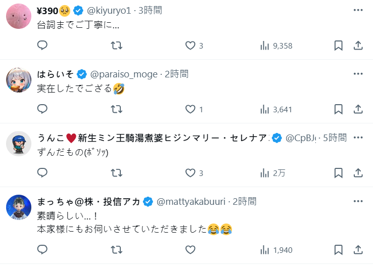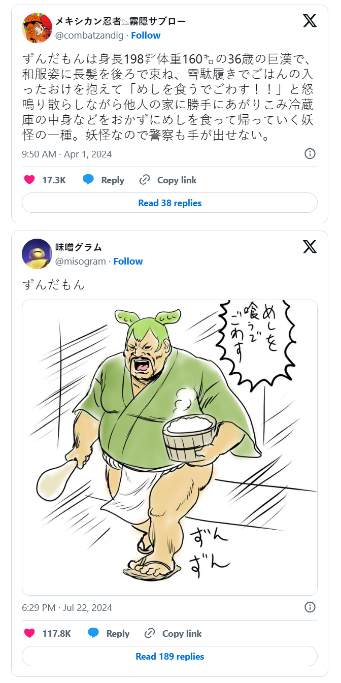 沒想到今年愚人節,一名漫畫家霧隠サブロー在 X 上開玩笑地發了推文,描述了一個設定:「ずんだもん是一位身高198公分、體重160公斤、36歲的巨漢妖怪。他穿和服、留著長髮,抱著裝滿白飯的桶子,不請自來進別人家裡,打開冰箱拿裡面的食材配飯吃,吃完後就揚長而去。因為是妖怪,警察也無法管他。」後來還吸引了插畫家味噌グラム進一步將角色具象化,繪製了一幅充滿幽默感的「巨漢ずんだもん」插畫,瞬間在網路上爆紅,成為了粉絲們惡搞創意所誕生的二次創作角色「ずんだどん ( 巨漢 )」。