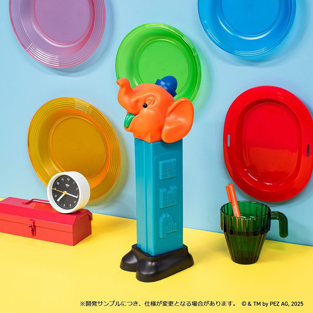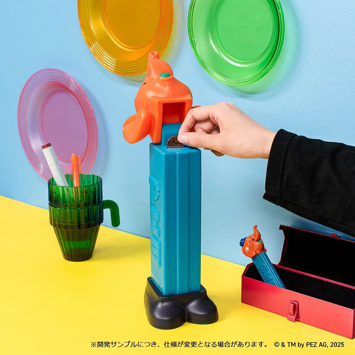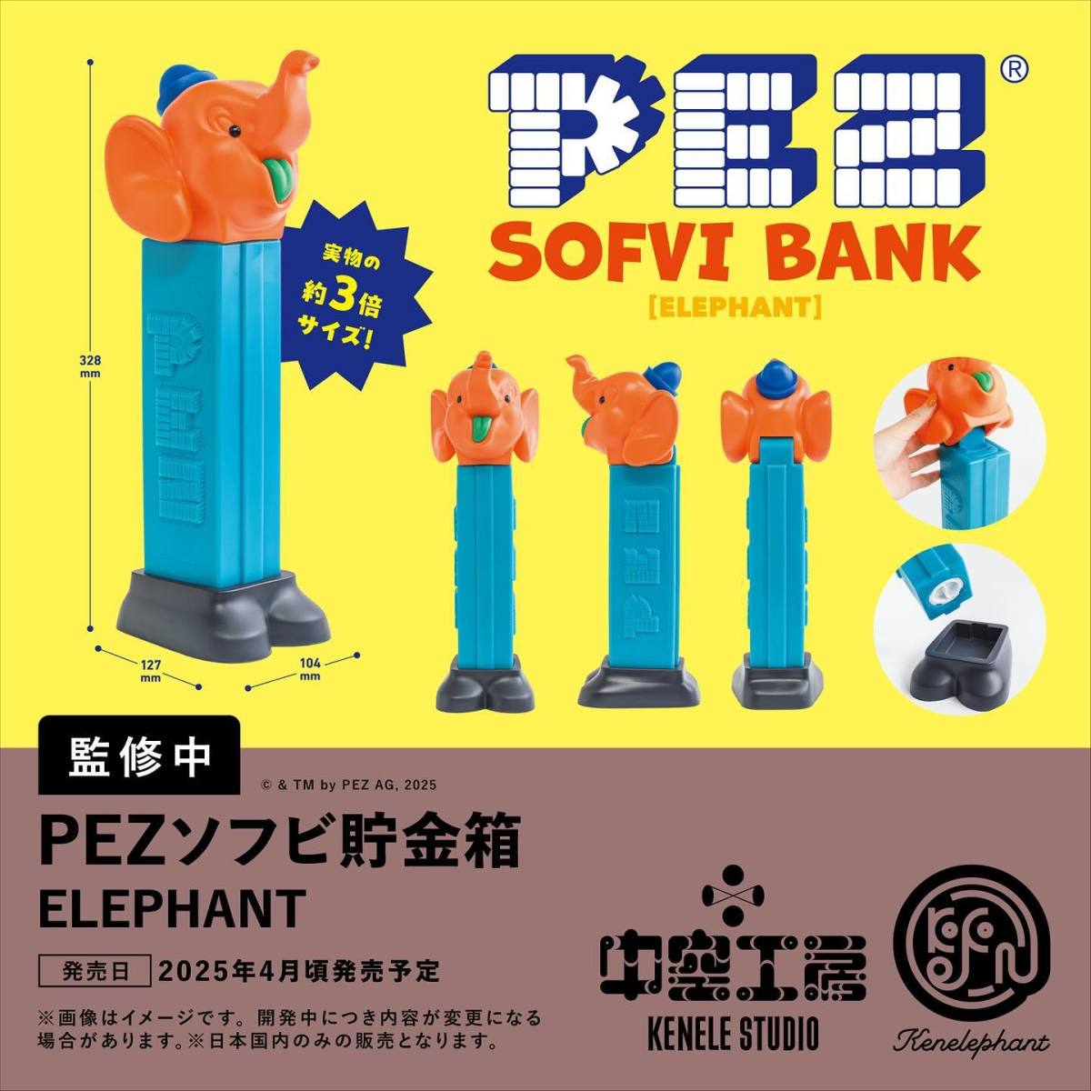 起源於奧地利、深受許多玩具人喜愛的玩偶水果糖 PEZ,最大特色就是擁有各式各樣玩偶頭的糖果匣,除了可愛的動物造型之外,PEZ 也積極與各大作品攜手、推出經典角色樣式的玩偶頭糖果匣。而這次 KENELEPHANT 製作的軟膠存錢筒則是將大象款 PEZ 糖果匣等比例放大三倍,只要推開大象頭就能夠存進硬幣,不僅充分再現了鮮艷配色,糖果匣上特色的 PEZ 字樣也考究還原,加上高達 32.8 公分的尺寸,擺起來真的超級可愛。
