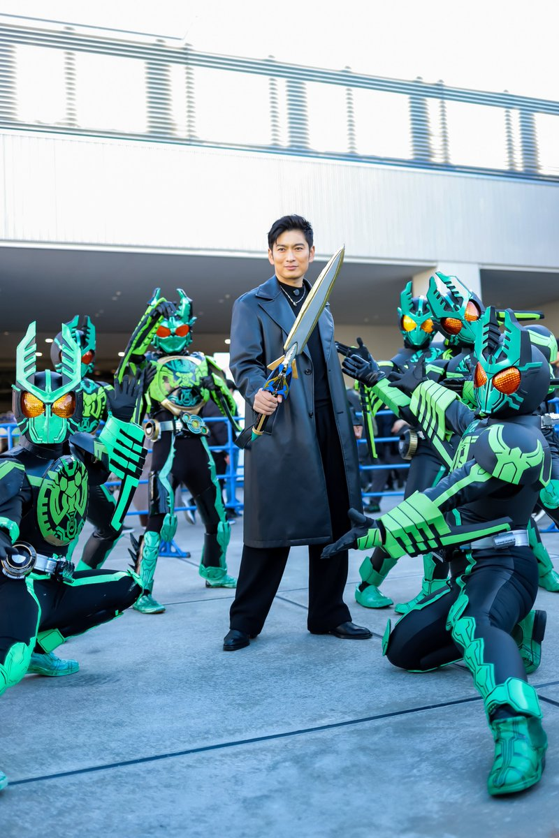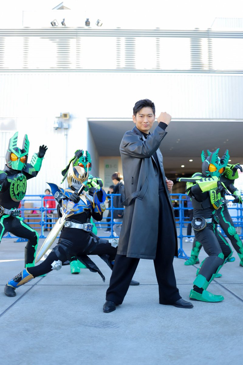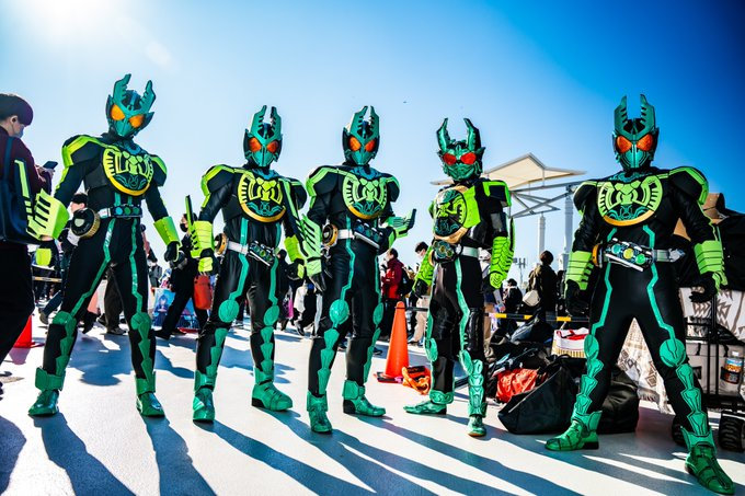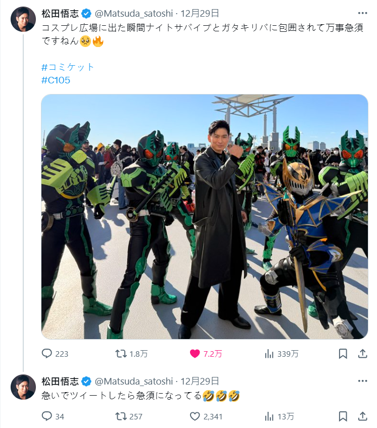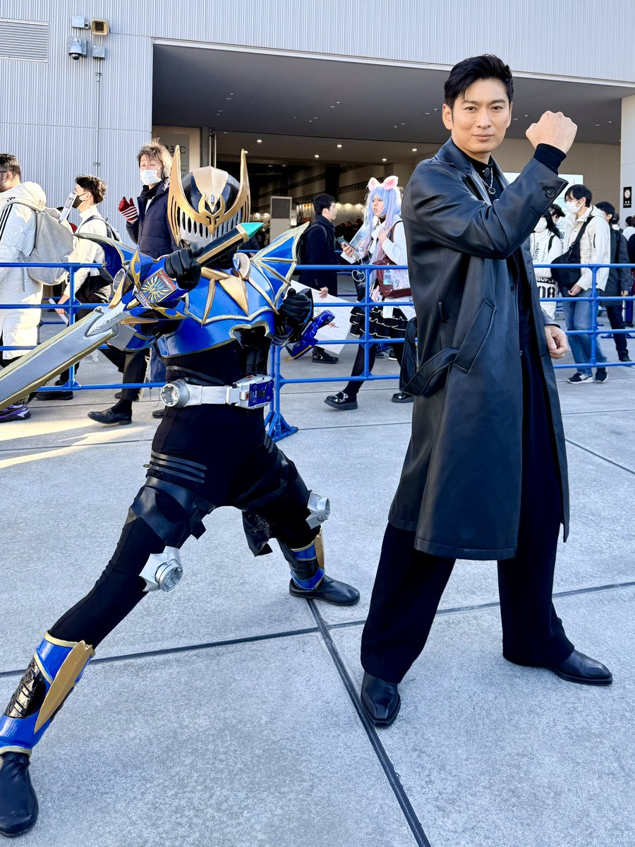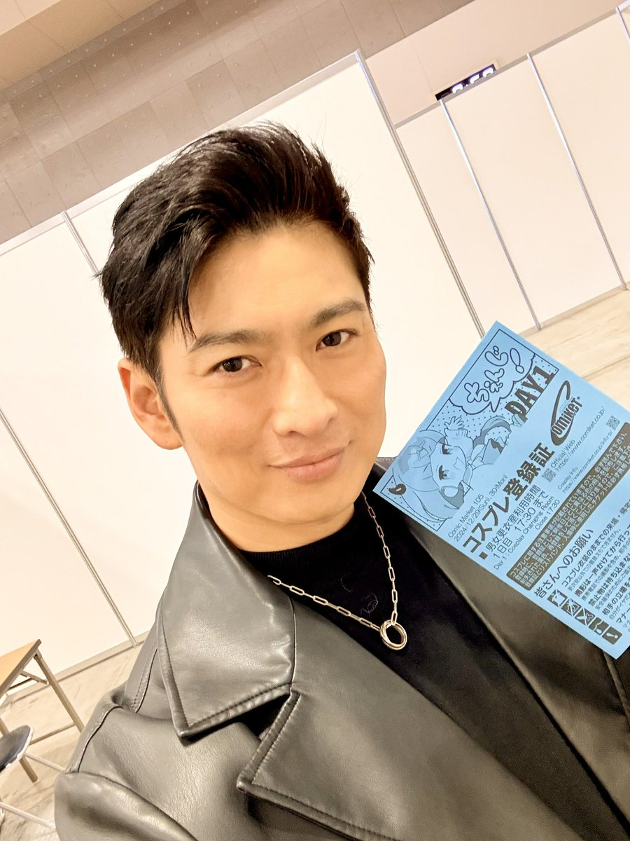 他接著幽默提到:「一走進Cosplay廣場,就被假面騎士OOO鍬螳蝗&生存夜騎包圍了,當下簡直是『萬事急須』啊!」文中還公開了他與 Cosplay 玩家的合影,這些 Coser 分別裝扮成《假面騎士龍騎》中的生存夜騎,以及《假面騎士OOO》中的假面騎士OOO 鍬螳蝗。