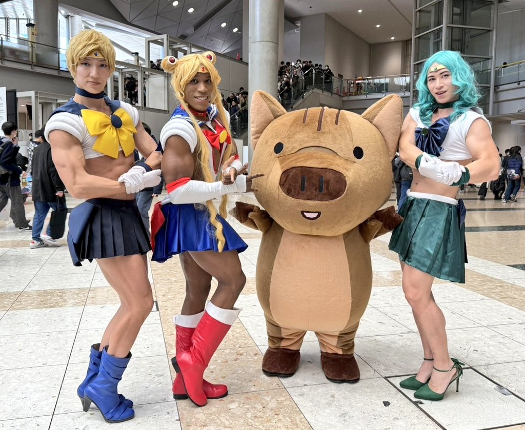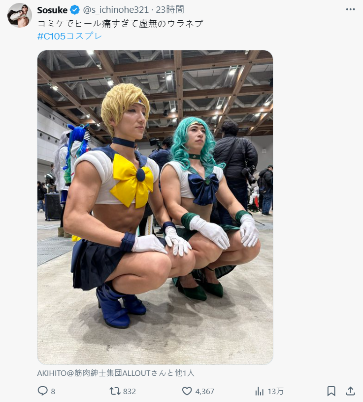 而本次日本健身網紅 AKIHITO 、 Sosuke,以及 Steve JEAN 所組成的「筋肉美少女戰士」也參戰 C105,壯碩的身材搭配美少女戰士的服裝瞬間成為場內焦點,也在網路上成為話題。