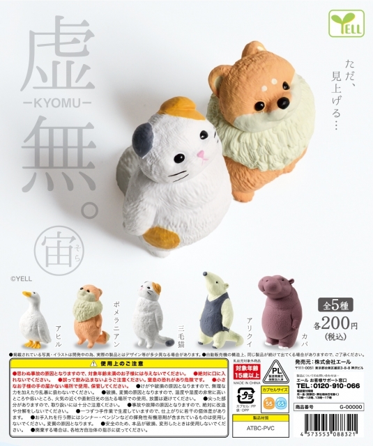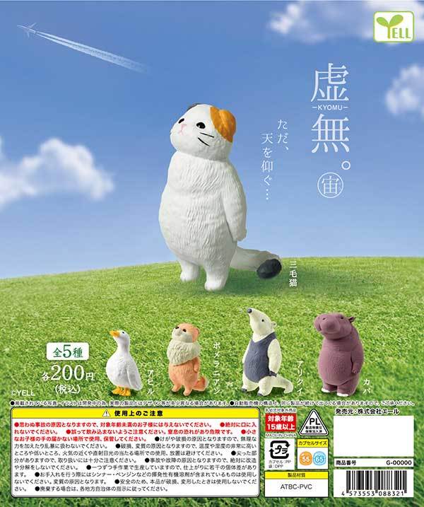 將可愛的動物以放空、癡呆放空表情呈現的 YELL「虛無」動物系列轉蛋,這次「虛無。~宙~」以彷彿無語問蒼天的抬頭造型,呈現出望向天空的可愛模樣,收錄有:白鴨、博美犬、三毛貓、食蟻獸以及巨大的河馬,發直的雙眼和呆呆地遠目,看起來有點懷疑人生...雖然造型簡單但搭配小道具或生活場景,就能展現出淡淡空虛感...