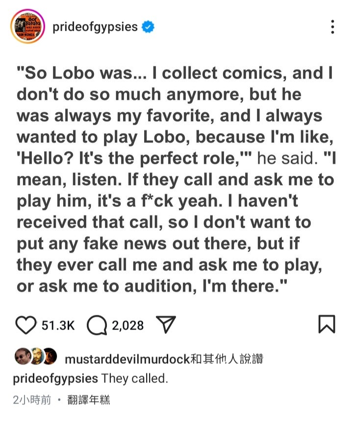 摩莫亞在 Instagram 發文轉貼了一段他過去的受訪內容截圖,當時正在回應扮演暴狼傳聞的他向媒體表示:「暴狼是個... 我是會收藏漫畫的人,我已經很久沒收藏了,但他一直是我最愛的角色,我也一直想扮演他,因為他根本就是完美的角色。聽著,若他們(意指 DC 影業)打電話來邀請我扮演他,我絕對二話不說就答應,但我還沒接到那通電話,所以我不想散播任何假消息,但如果他們要我演,或是要我去試鏡,我絕對報到。」然後摩莫亞則在這張截圖的貼文中附註:「他們真的打給我了。」