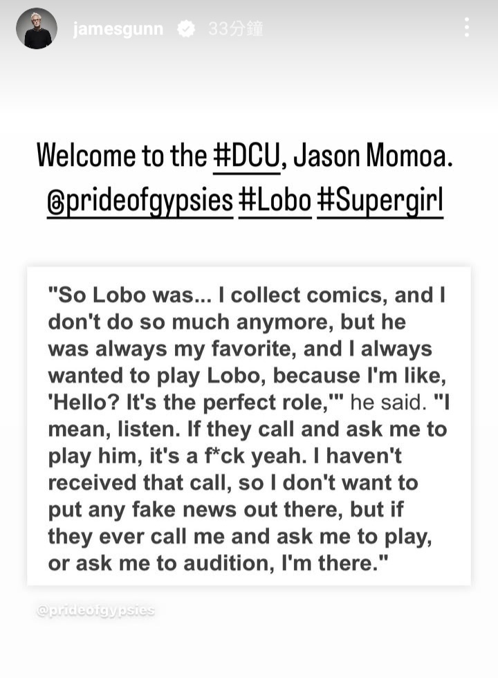 在上一代 DC 宇宙扮演「水行俠」的傑森摩莫亞(Jason Momoa)稍早正式宣佈,他已經確定加入詹姆士岡恩(James Gunn)領導的新世代 DC 宇宙,而他要擔綱的角色,就是傳聞已久的星際獵人「暴狼」!