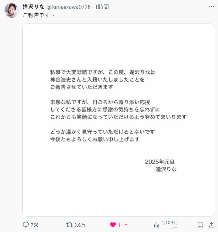 喜訊則從逢澤莉娜的 X 上發布婚訊,並指出 : 「雖然我還不成熟,但感謝一直以來支持和鼓勵我的大家,並努力讓大家繼續保持笑容。希望大家能溫暖地守護我們。今後也請多多指教。」