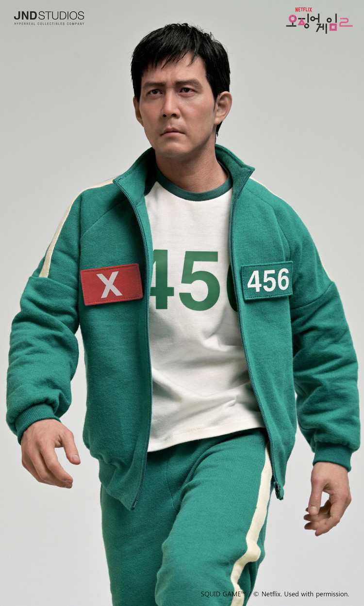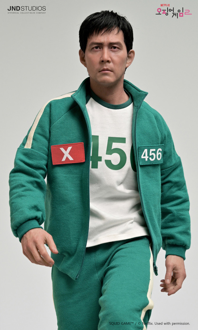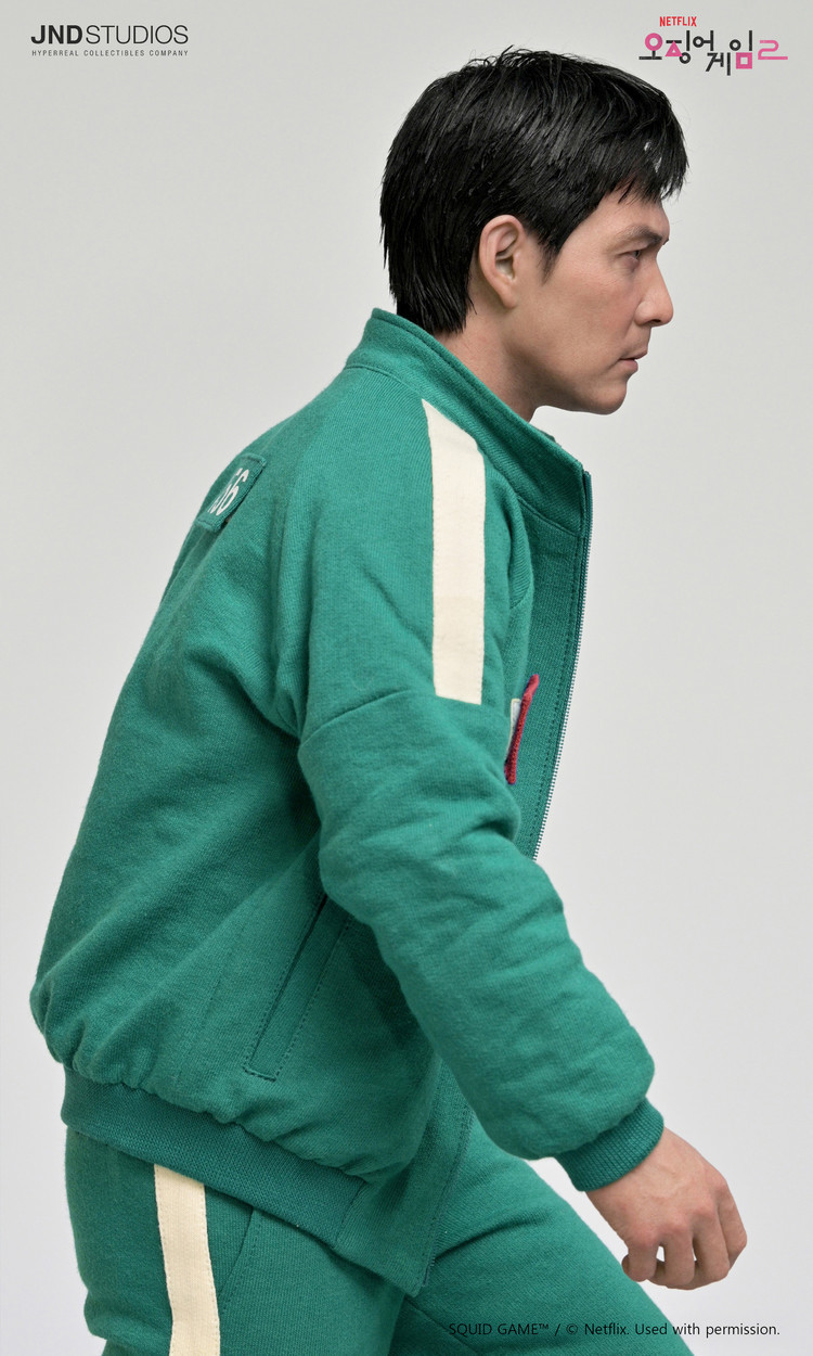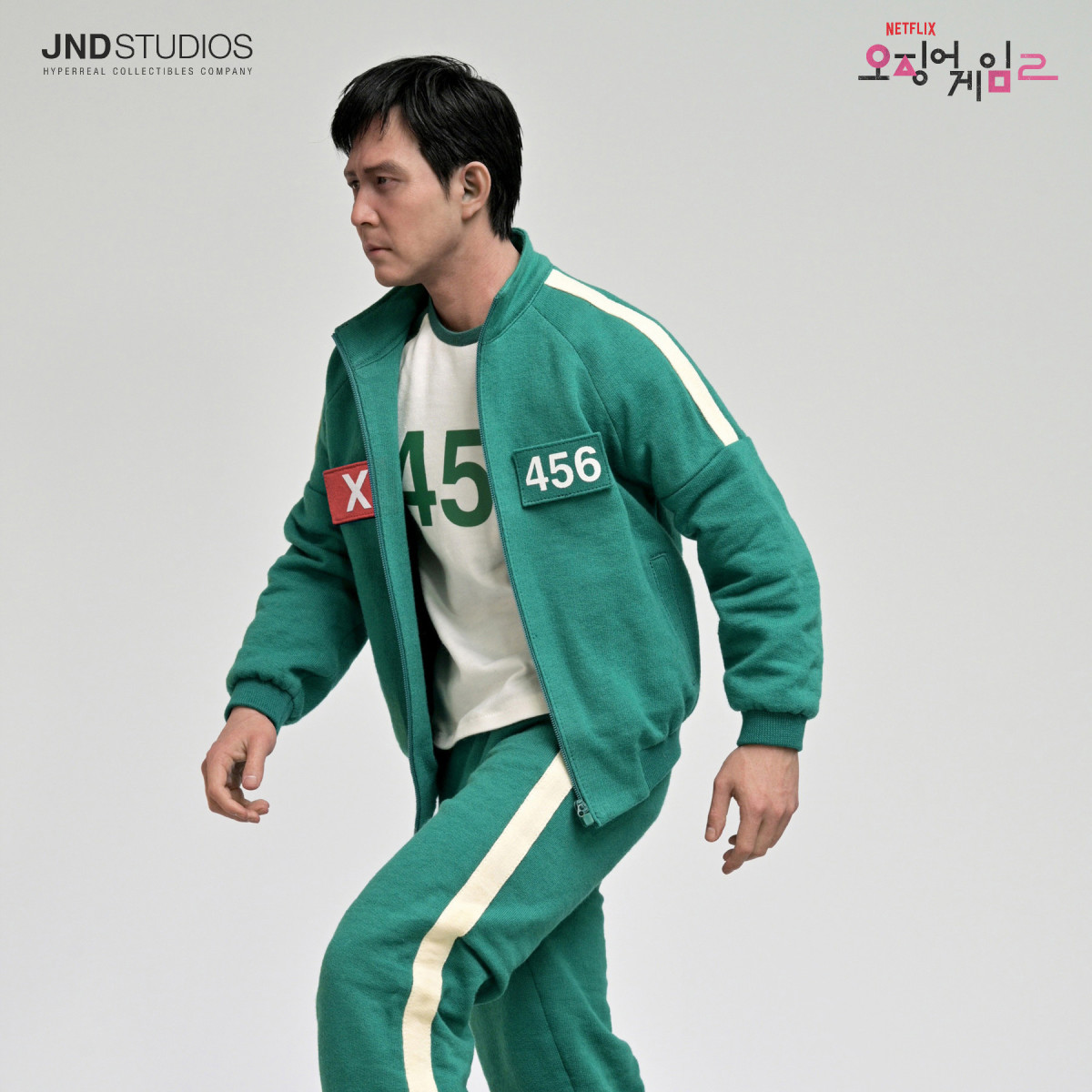 本次的成奇勳 1/3 比例收藏雕像高約 66 公分,採用矽膠材質與植髮技術超寫實的還原演員李政宰的標誌五官,眼角的細紋、皮膚的顆粒等細節都被細膩的製作出來,將第二季中成奇勳飽受摧殘的憔悴面容精緻重現!服裝部分使用布料材質打造了玩家所穿著的綠色運動服和白色休閒鞋,附上了左胸與身後的 456 號布章和右胸代表不繼續進行遊戲的紅色「X」布章。底座製作了劇中標誌性的粉色系迷宮階梯造型地台,並在側邊附有一個方形的工作人員面罩,全方位的展現了《魷魚遊戲》獨特的暴力美學與讓人膽戰心驚的氛圍!