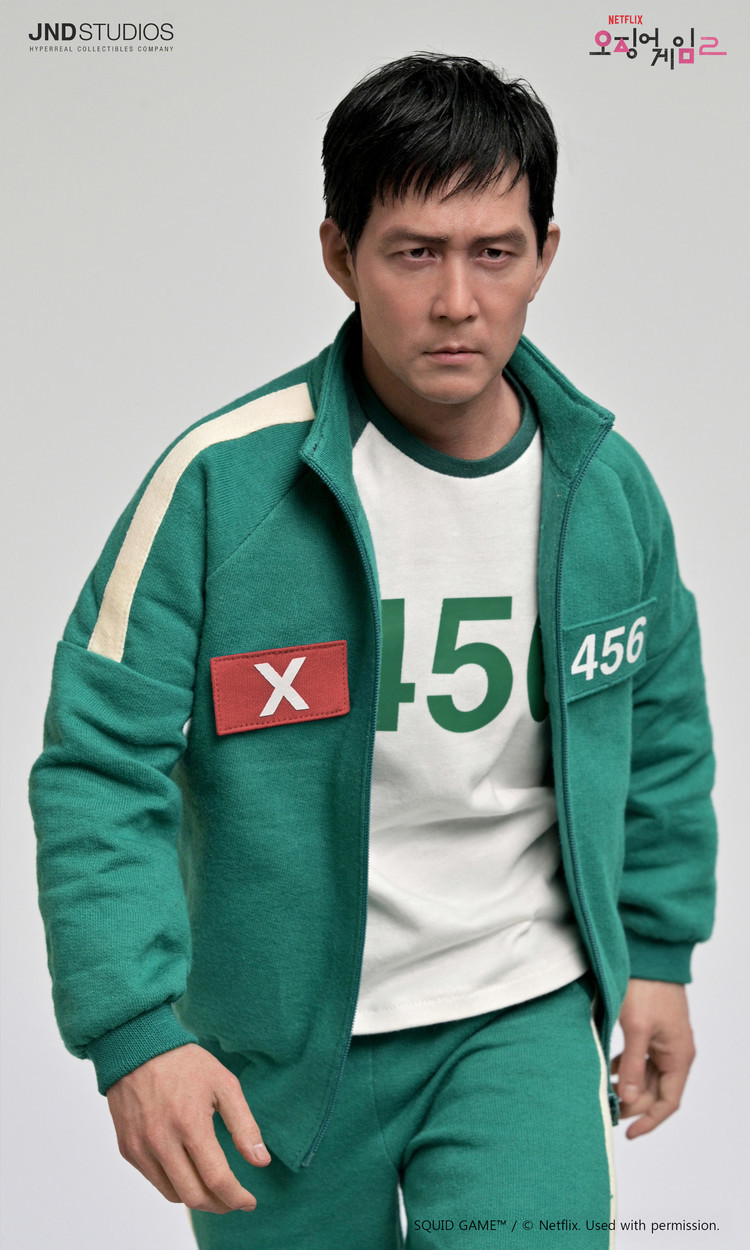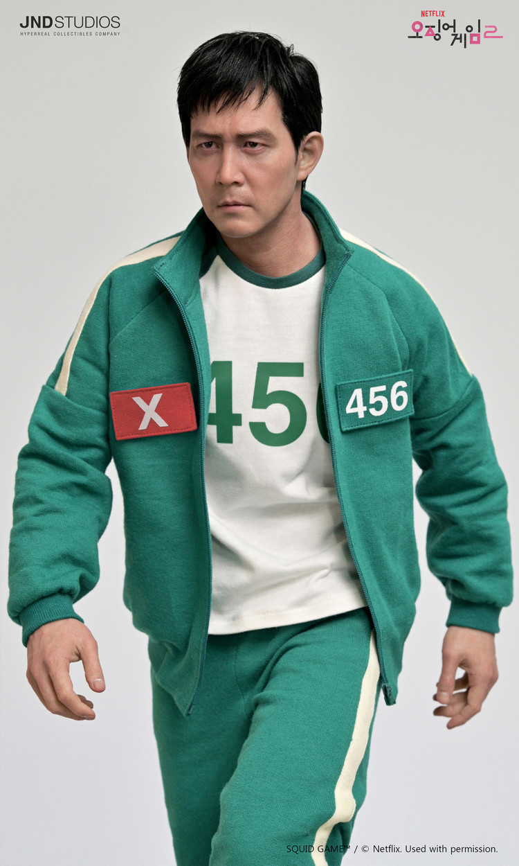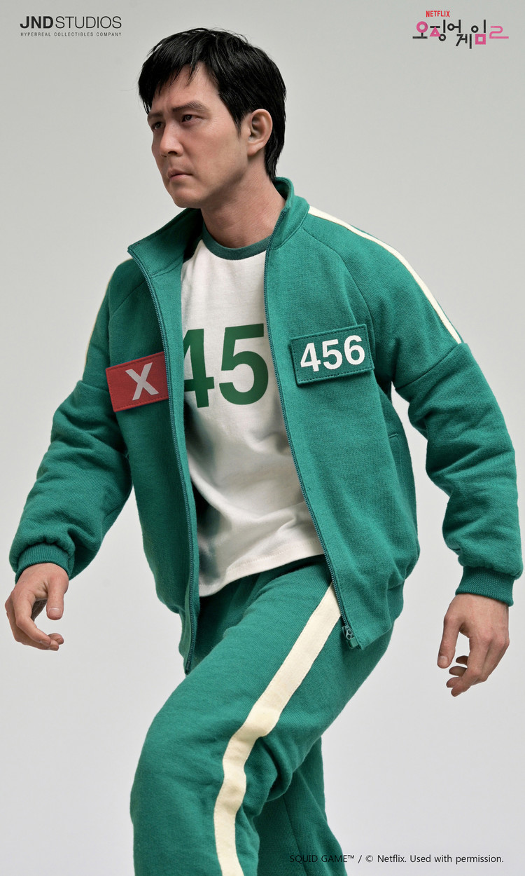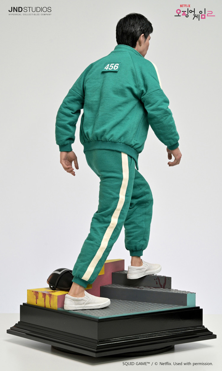 本次的成奇勳 1/3 比例收藏雕像高約 66 公分,採用矽膠材質與植髮技術超寫實的還原演員李政宰的標誌五官,眼角的細紋、皮膚的顆粒等細節都被細膩的製作出來,將第二季中成奇勳飽受摧殘的憔悴面容精緻重現!服裝部分使用布料材質打造了玩家所穿著的綠色運動服和白色休閒鞋,附上了左胸與身後的 456 號布章和右胸代表不繼續進行遊戲的紅色「X」布章。底座製作了劇中標誌性的粉色系迷宮階梯造型地台,並在側邊附有一個方形的工作人員面罩,全方位的展現了《魷魚遊戲》獨特的暴力美學與讓人膽戰心驚的氛圍!