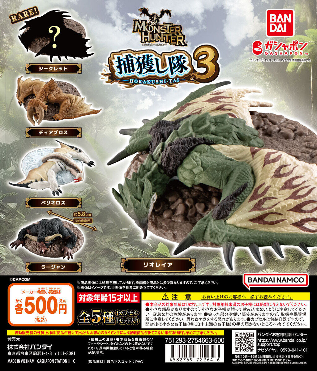 由日本萬代轉蛋事業部 GASHAPON 發行、以人氣電玩《魔物獵人》為主題推出「捕獲隊」、「捕獲隊2」之後,又要在 2025 年 1 月第 5 週發售最新的「捕獲隊3」(捕獲し隊3)!建議售價為每轉 500 日幣。