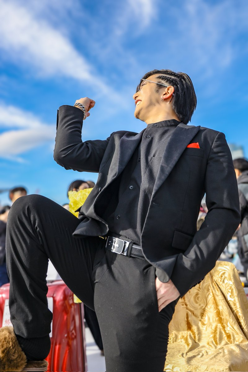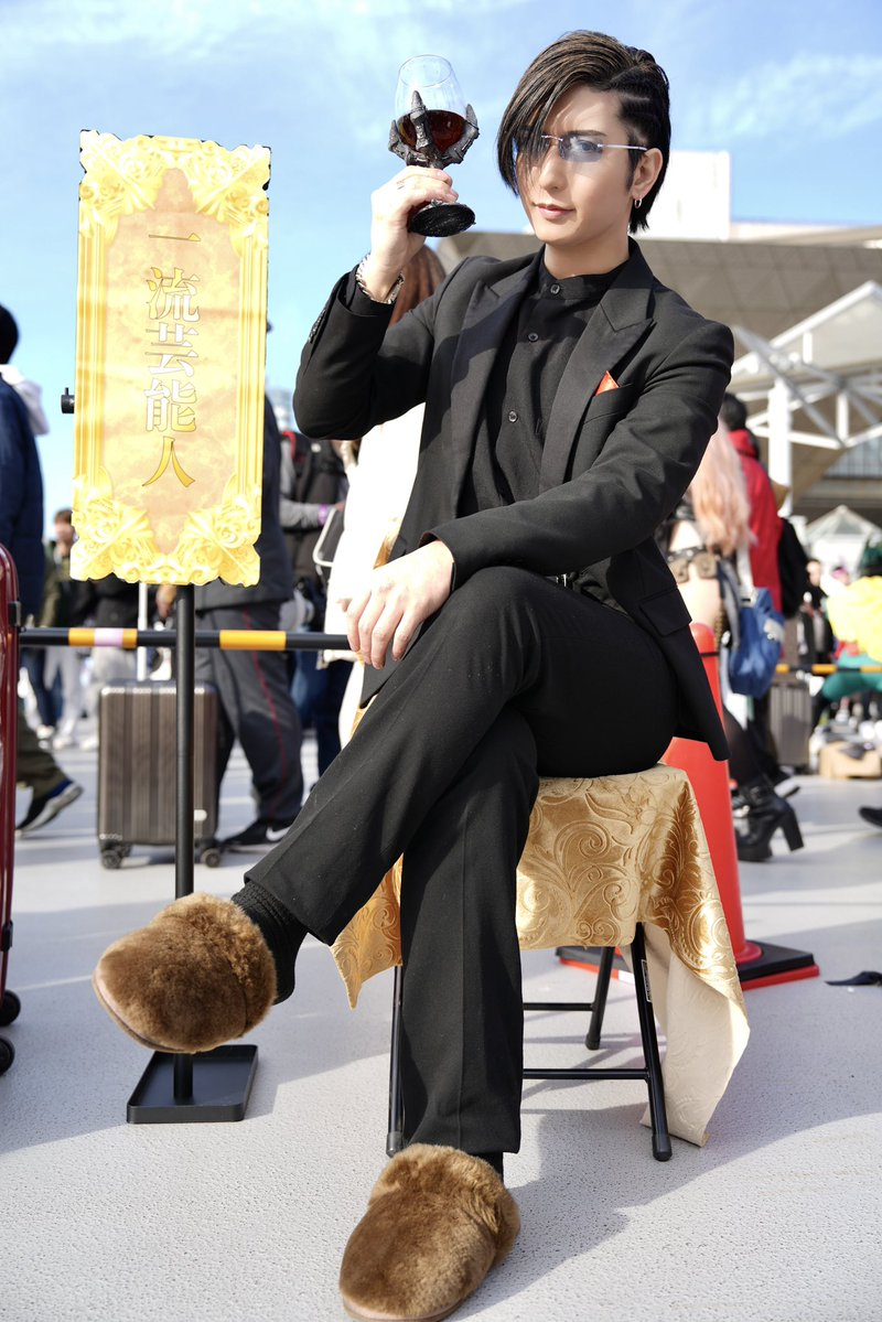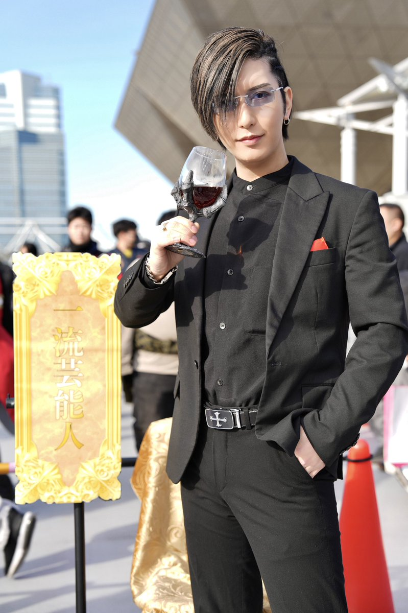 這次穿上全黑合身西裝搭配絨毛鞋,搭配墨鏡跟髮型,略顯自負的神韻完全還原 GACKT 在螢光幕前的氣質 ( 其實這也是 1 月 1 日日本節目《一流藝人品鑑中》(芸能人格付けチェック)中 GAKCT 的造型,已經在預告中曝光 )。