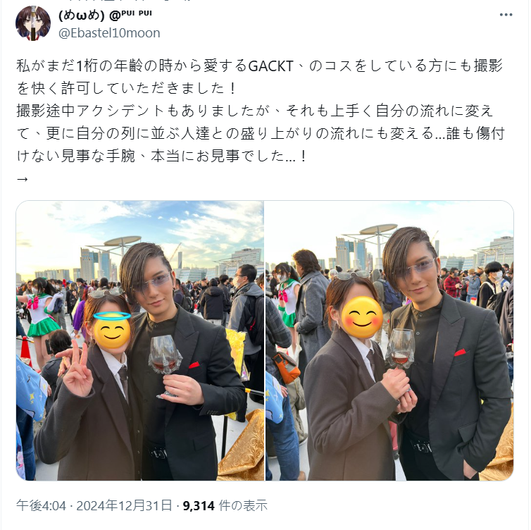 更有網友稱讚,在讀小學時就一直喜歡的 GACKT,這次遇到大帝国皇帝山下的 Cos,非常爽快地讓我拍照!拍攝途中雖然發生了一些小意外,但他不僅化解了狀況,還成功將氣氛轉變成自己的舞台,甚至讓排隊等著的人也跟著嗨了起來。這種高超又不傷害任何人的應變能力,真的是讓人佩服到不行!