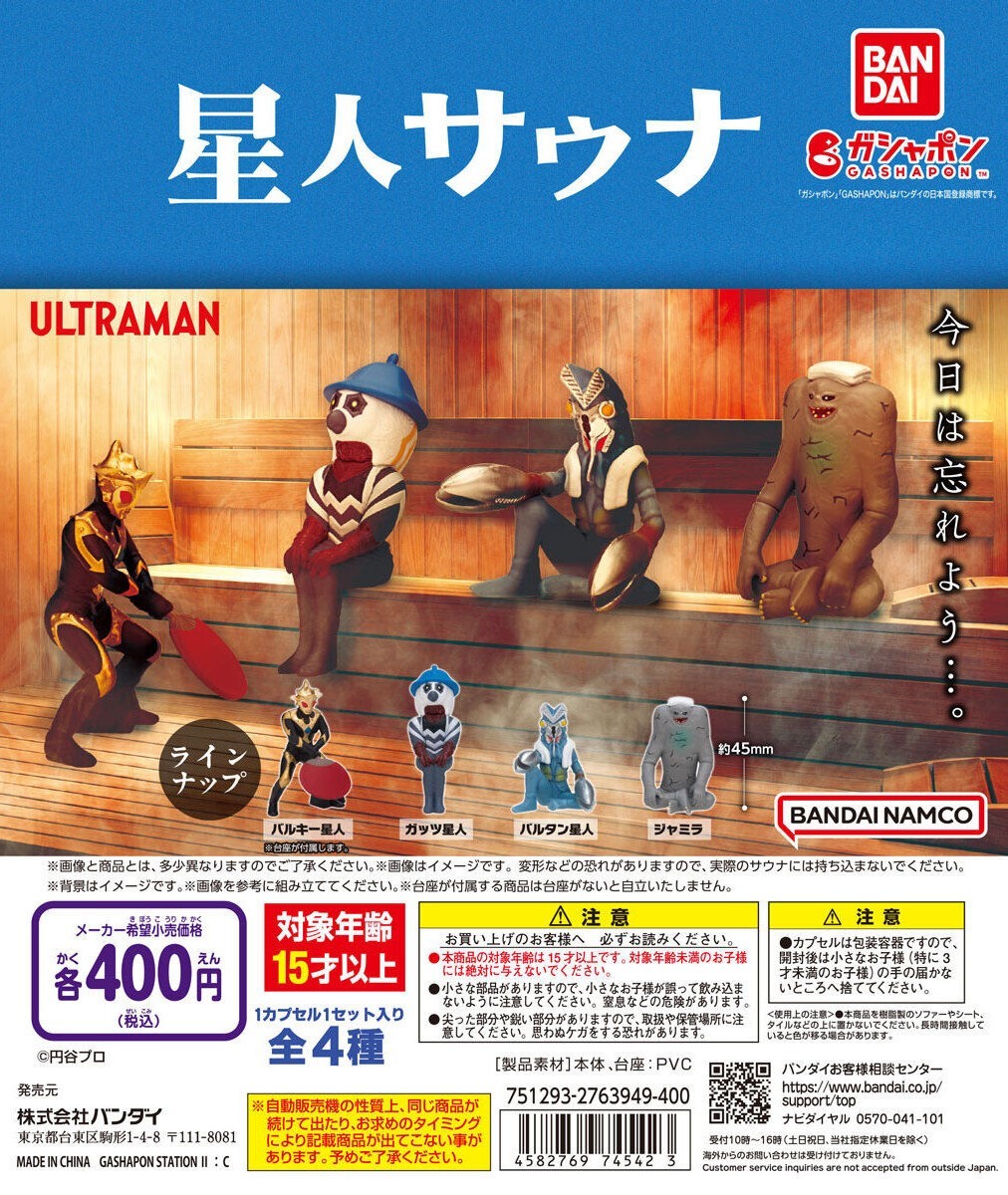「超人力霸王 星人桑拿」延續系列在三溫暖中享受治癒疲勞的概念,讓《超人力霸望》中當場人氣怪獸們舒舒服服地披著毛巾、悠閒加入桑拿陣容!收錄有:巴爾坦星人、棲星怪獸札米拉、戴著桑拿帽的加茲星人以及在三溫暖中以毛巾扇香味和熱氣給使用者的師傅—熱波師 巴爾基星人!在約 4 ~ 5.5 公分大小的尺寸,刻劃出生動的坐姿造型~怪獸也要桑一下!