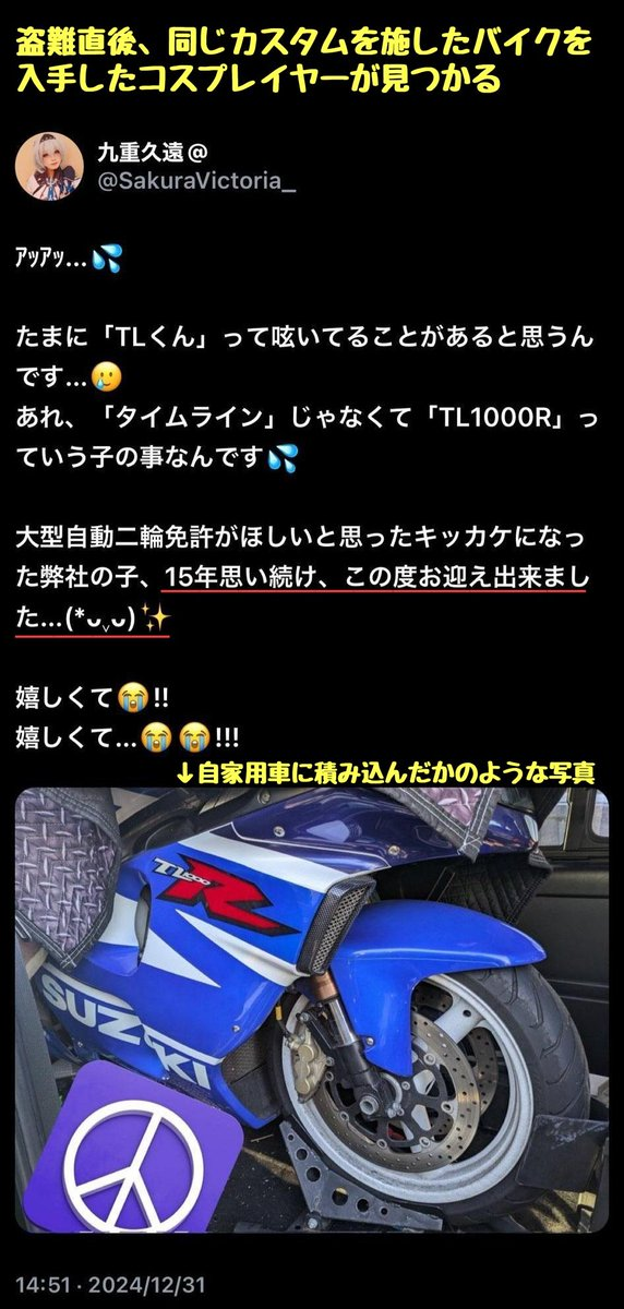 不過近日日本 X 上,有個引起討論的 Coser ,近期 Po 出一輛最近擁有的機車,卻被抓包似乎與近期一位住在愛知縣的網友遺失的車款相同。沒想到過兩天就跑去警察局自首,還被新聞報導出「39歲男子」真實身分,引起網民熱議,原來平常貼出巨乳美女 Cos 照的他,居然是個男人...。