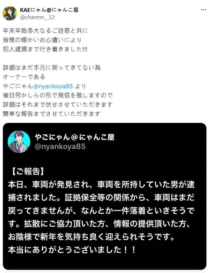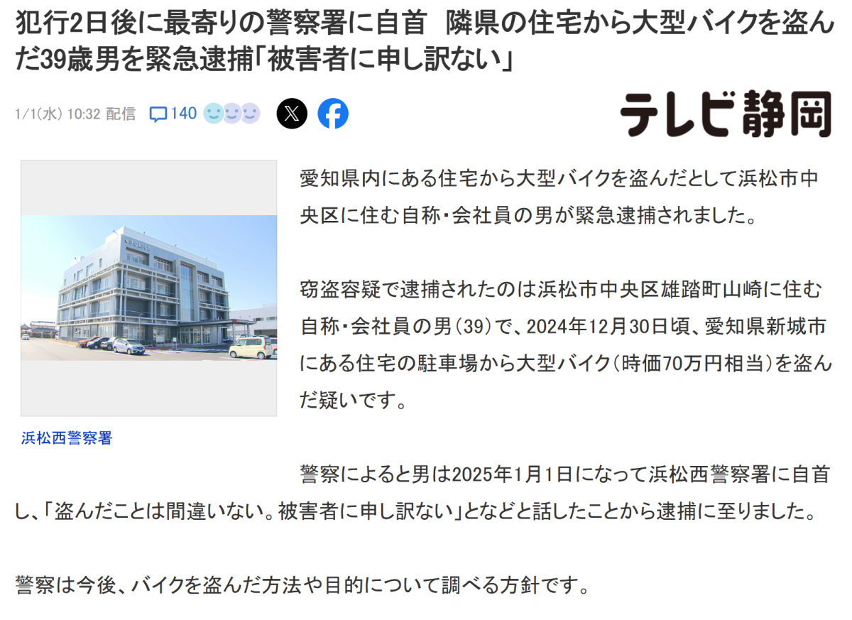 結果新聞也報導出這則消息,是一名 39 歲的男子自稱 12/30 在愛知縣的停車場偷竊的,跑到警局自首並歸還車輛。