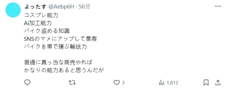 讓網友直呼真的厲害,不但會 Cos、會 AI 修圖、知道如何偷機車還知道怎麼在不知不覺中運走,勤奮經營社群媒體吸引人氣,老實說,如果做正當生意,感覺這些能力完全可以大展身手啊!