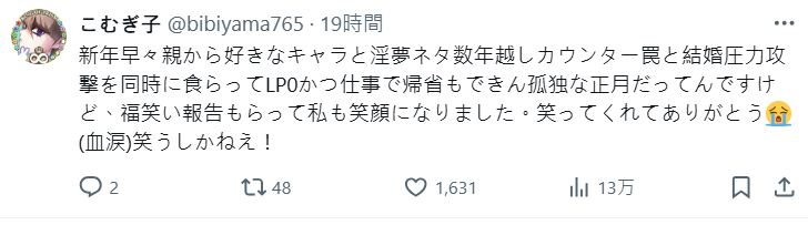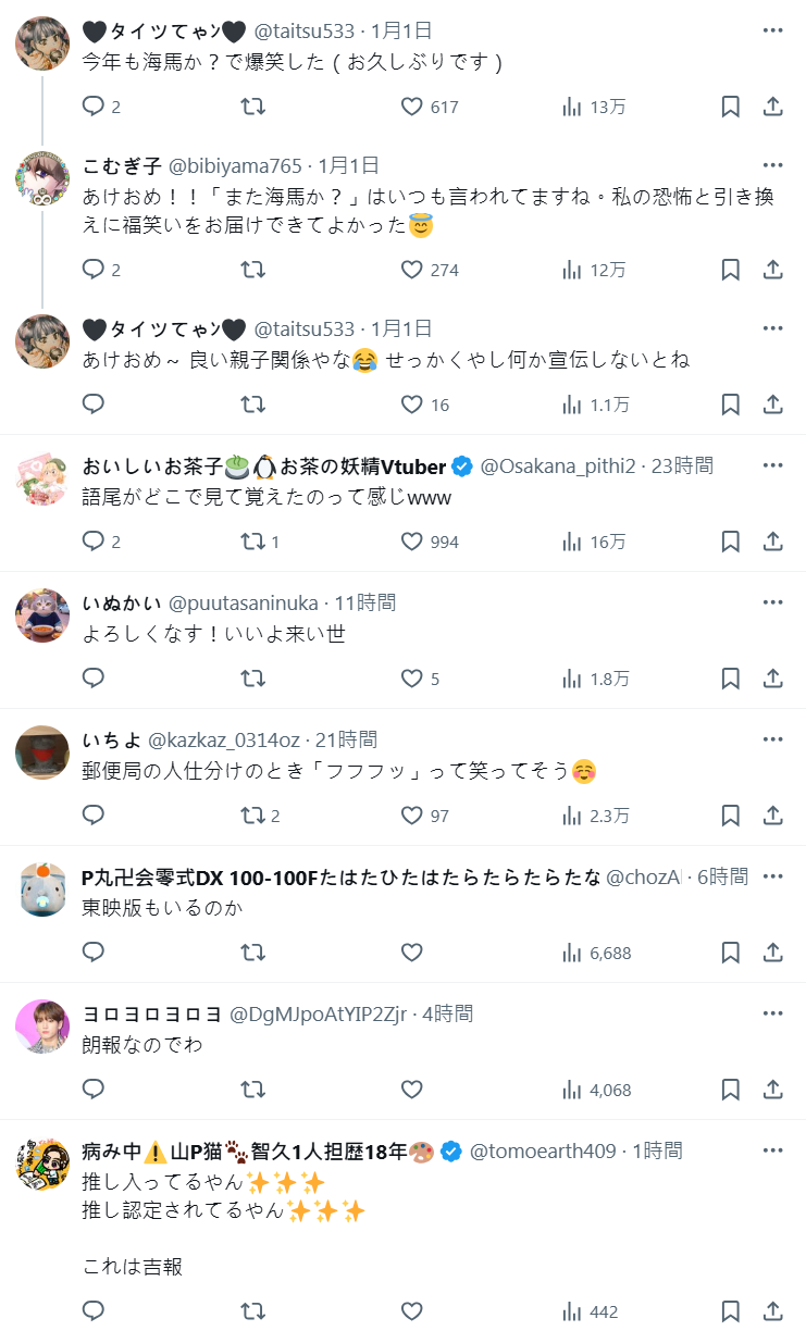 推主也表示,新年一早就被媽媽用自己最喜歡的推祝賀,加上跨年的情侶攻擊反擊陷阱,再加上結婚壓力攻擊,瞬間被打到 LP 直接歸零。因為工作忙得沒辦法回家過年,變成一個孤單的新年。然而,收到海馬的賀年卡後,我也變得笑容滿面了。謝謝媽媽讓我笑出來,真是太幸福了!