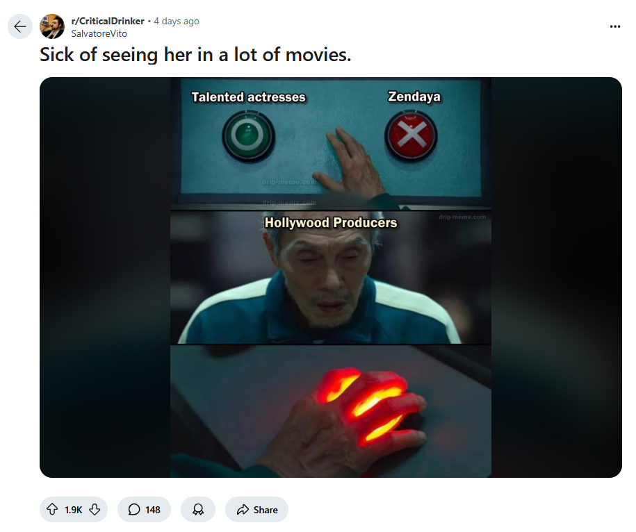 放眼當今好萊塢,千黛亞(Zendaya)無疑是當今最炙手可熱的新生代之一,漫威宇宙的《蜘蛛人》(Spider-Man)系列、《沙丘》(Dune)系列等商業大作都有她戲份吃重的身影,更獨挑大樑主演了《挑戰者》(Challengers)這樣高水準的劇情片,但或許是人紅招嫉,歐美地區有些觀眾已經對她的高曝光率愈來愈不滿,最近更是頻頻做哏圖狂酸,好萊塢的各大片廠、導演和製片人,正在不斷將千黛亞「強行餵食」給不想看到她的觀眾。