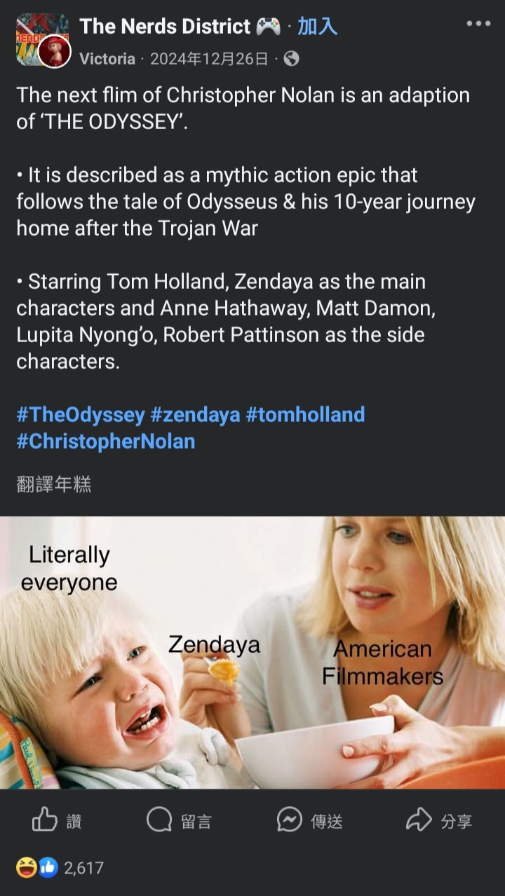 某些觀眾對千黛亞的反感,其實早就存在好一段時間,只是一直沒大肆爆發,是直到最近,克里斯多夫諾蘭(Christopher Nolan)宣佈他的下部電影會改編《奧德賽》(Odyssey),瞬間引起全球廣泛議論,而許多人就是這時才意識到,原來千黛亞也在《奧德賽》的卡司名單中,連男友湯姆霍蘭(Tom Holland)也是主角,很多觀眾因此抱怨,現在連諾蘭的電影都得看到千黛亞。
