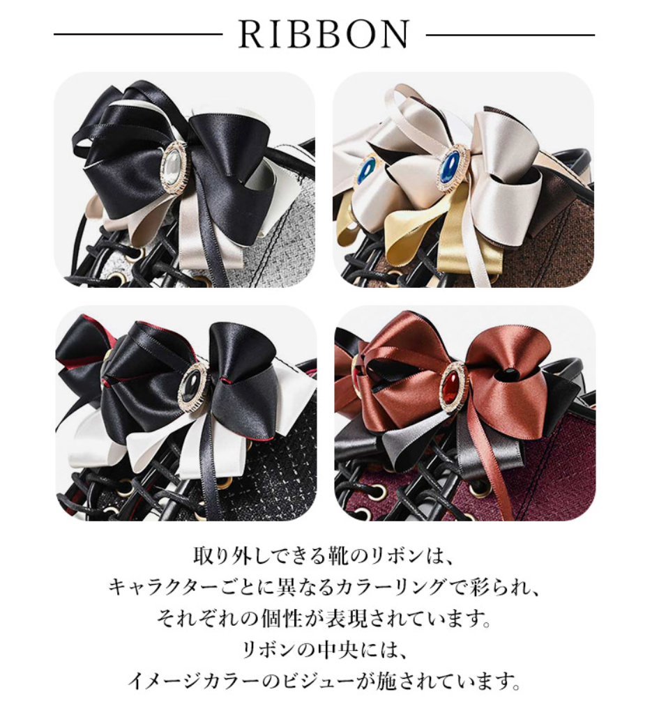 這次推出的款式包含 : 中島敦、太宰治、芥川龍之介、中原中也,將角色形象融入設計的短靴。靈感來自作品中的多位角色。每雙短靴都搭配可拆卸的蝴蝶結鞋飾,顏色依角色形象而異,呈現角色獨特的個性。蝴蝶結中央鑲嵌了與角色形象相符的寶石,細節滿滿。