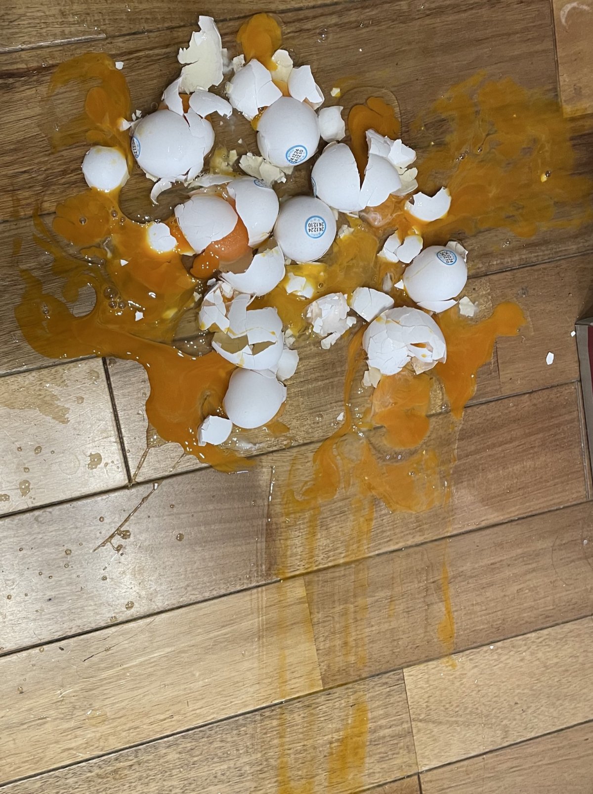 事件起因於岡井ハルコ失手,不小心將一盒雞蛋給摔破在地上,導致盒子裡的10顆雞蛋全部破爛,地板的畫面一片狼藉。這一意外事故讓許多人感到十分震驚,但漫畫家卻以創意解決問題的方式,將困境轉化為靈感。