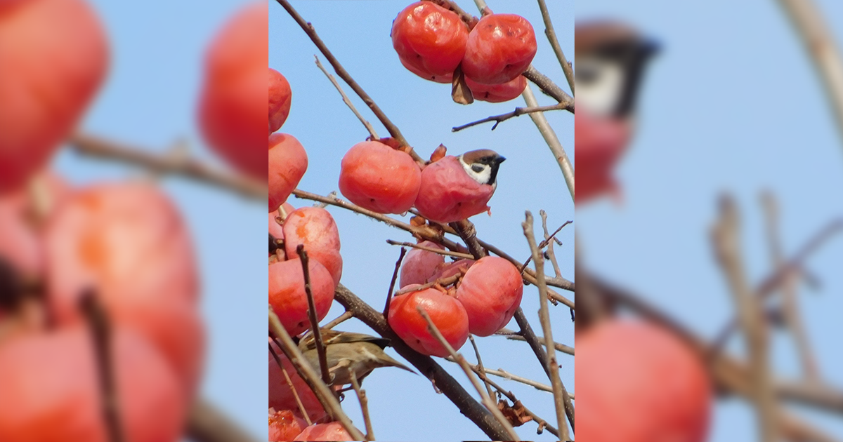 從照片中可以看到,一隻麻雀彷彿嵌在一顆熟透的柿子裡,畫面非常有趣。但仔細觀察後會發現,這其實是一個巧妙的視覺錯位——麻雀剛好站在缺了一塊的柿子正後方,與柿子的輪廓完美重疊,看起來就像是麻雀從柿子中探出頭來。