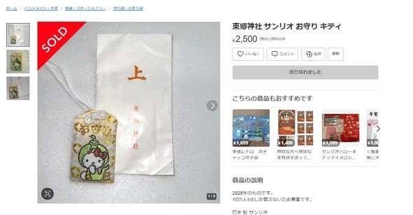 東京東郷神社推出的「三麗鷗角色健康御守」再次在元旦販售,但1月2日卻傳出其中的Hello Kitty等部分角色已即日售罄,引發了廣泛關注。這些Hello Kitty御守以2025年生肖蛇為主題,出現在二手交易平台上,價格高達原價的五倍,引起了眾多網友的熱議。