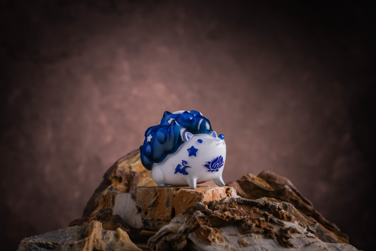 另一款刺刺系列作品【青花瓷刺刺】,創意來自於國立故宮博物院院藏「明 宣德青花四季花卉紋大碗」,將刺刺作仿瓷器的材質,繪上四季花卉的圖樣,意旨刺刺的設計如同四季千變萬化,呈現復古典雅又可愛趣味的造型。精緻的尺寸使其在掌心中獲得恰到好處的放置。觀賞時會發現背部、胸前和帽簷上的湛青色漸層,以及花卉紋飾,猶如瓷器般迷人。整體呈現出一種晶瑩剔透的質感,配合典雅的刺刺和瓷器紋飾,讓人沉浸在四季變化中的美好氛圍之中。