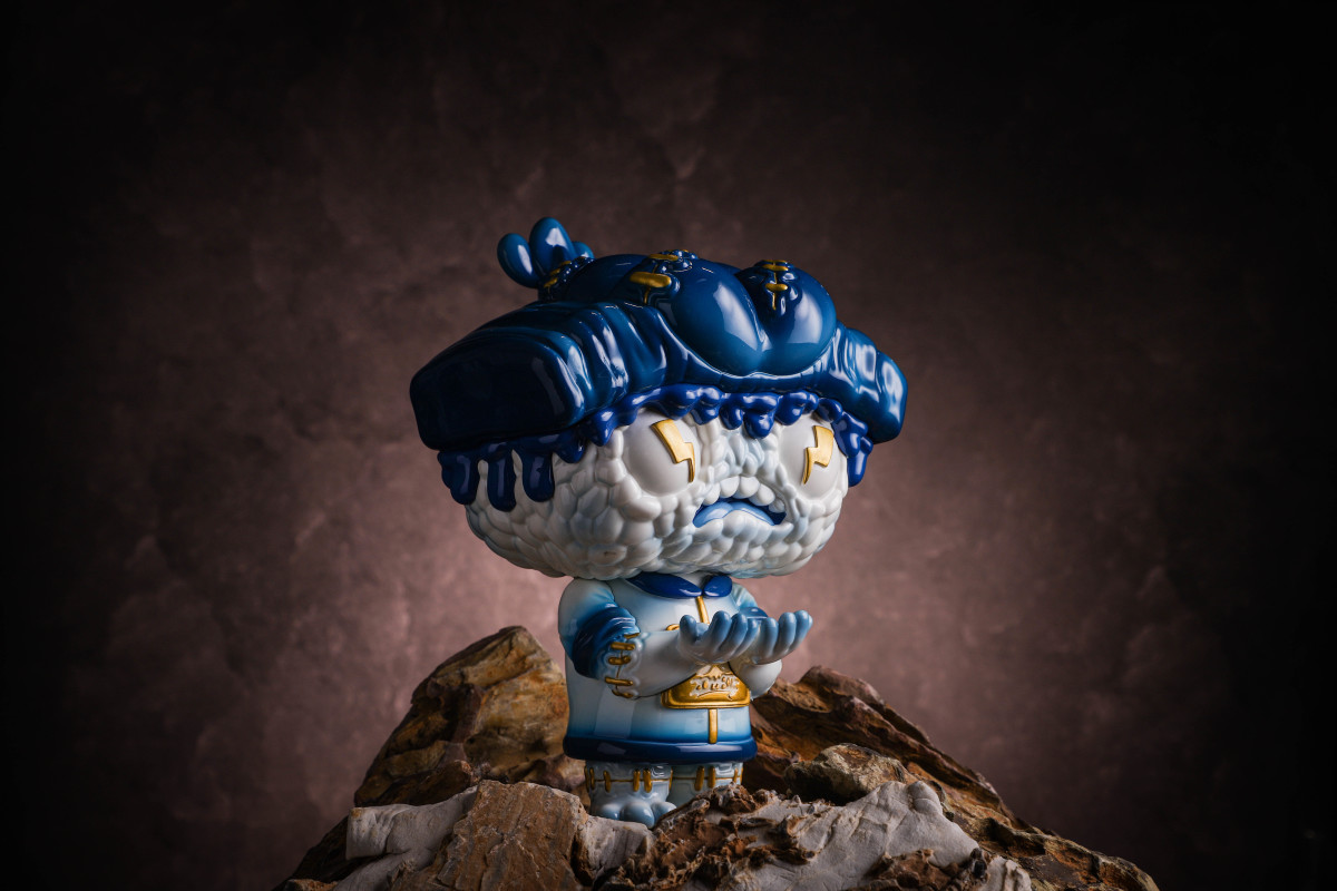 SU屍和刨冰熊則透過創意設計應對環境問題、倡導減少剩食和全球暖化行動。這些創作共同增強了公眾意識,將藝術與批判性的社會對話結合在一起。本作品【SU屍Alpha-青花瓷】創意來自於國立故宮博物院藏館「清 乾隆 銅胎畫琺瑯白地藍花執壺 」為設計參考,以仿青花瓷的上色表現,結合壺身的花卉圖樣以金色的漆料點綴輔助。提升整體收藏品的質地,使SU屍呈現穿越時空的衝突美感。